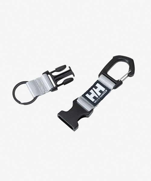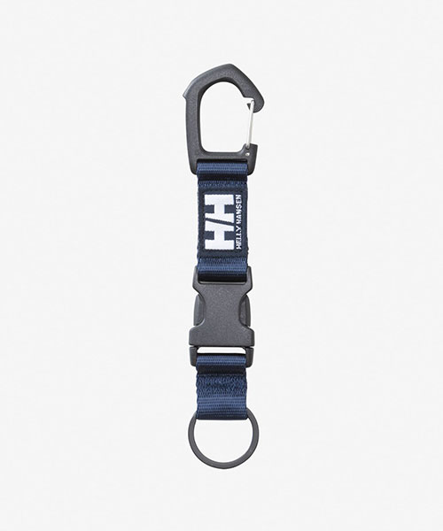 HELLY HANSENのロゴを効かせたキーホルダー。カラビナ側とキーリング側の間にバックルがあるため、鍵を使うとき手軽に取り外せるのが魅力です。