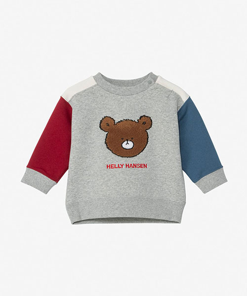 子どもたちに「自然とのつながり」「冒険心」「自尊心」「好奇心」を伝える、HELLY HANSENのオリジナルストーリー。そこに登場するヘリーベアをアイコンにした、HELLY BEARコレクションのベビー用スウェットトップです。このコレクションでは、着ていて楽しく、知育にもなるアイデアを盛り込んでいるのが特徴。フロントに、パイル状の立体感があるサガラ刺繍をあしらい、その風合いを楽しむことができます。生地には、環境配慮型素材を採用した裏起毛スウェットを採用。肉厚感のある裏起毛スウェット生地は、肌触りがよく、保温力が高いのが魅力です。コットンとポリエステルの混紡素材で、ナチュラルな風合いと乾きやすさが両立。空紡糸によるふっくらとしたボリューム感と、裏起毛のやわらかさを兼ね備えています。