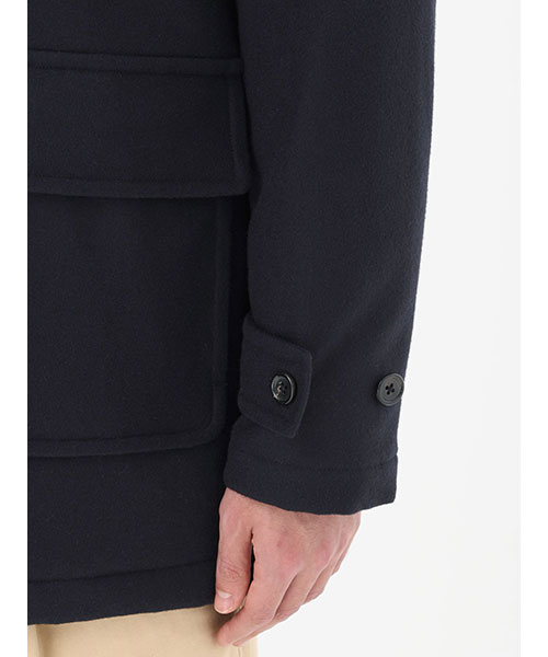 フロントなどのボタンは、高級感がある水牛ボタンを採用。襟を立ててチンフラップで留めると、首まわりの保温性が高まります。環境への負荷に配慮して、素材の一部にリサイクル糸を使用しています。