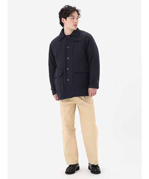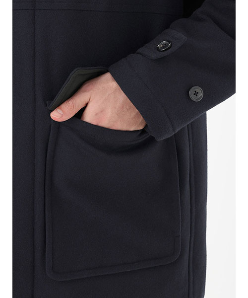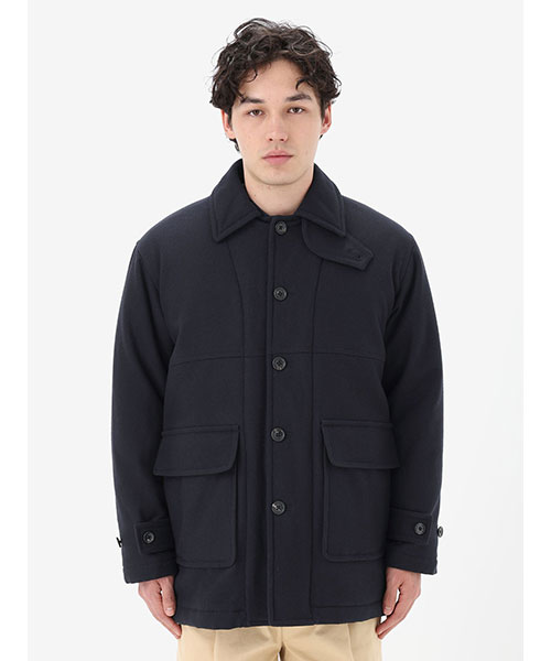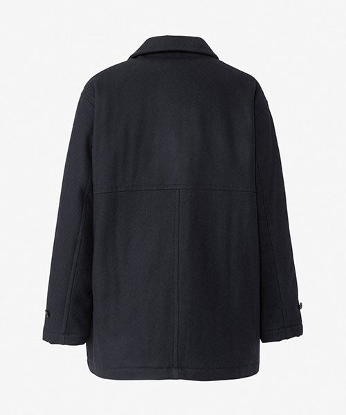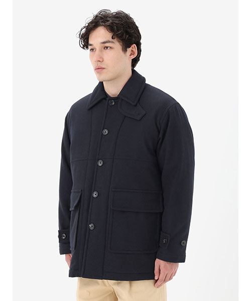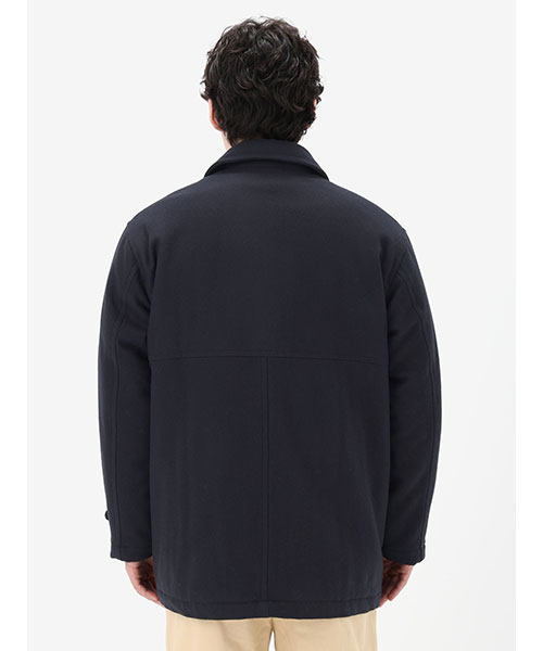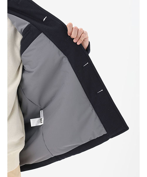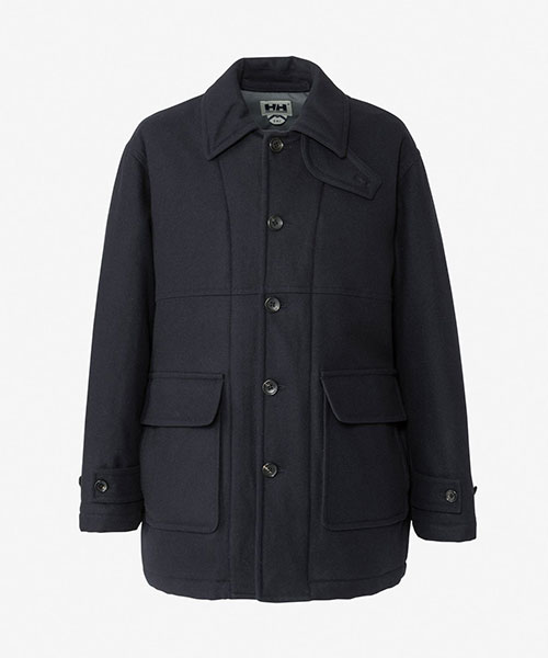 海の服の歴史を刻むHELLY HANSENが手がける、海のロマンを詰め込んだワークウエアコレクション「ROYAL MARINE CLUB(ロイヤル マリン クラブ)(R.M.C)」のコート。クラシカルなデザイン×現代テクノロジーを融合させたアイテムです。ピーコートの前身であるサブマリンコートのデザインをベースにした、クラシカルな印象のショートコート。素材には現代的なテクノロジーを取り入れ、リサイクルウールを中心としたメルトン生地の表地と、高い防風性のあるWINDSTOPPER products by GORE-TEX LABSの裏地、かさ高を維持しやすいプリマロフトの中わたを組み合わせました。リサイクルウールを使用したメルトン生地は、やわらかな風合い。防風性があるため衣服内の暖かさを逃しにくい裏地と、軽量感のある中わたを合わせることで、一般的なメルトン生地のコートより軽くて保温性が高いのが魅力です。