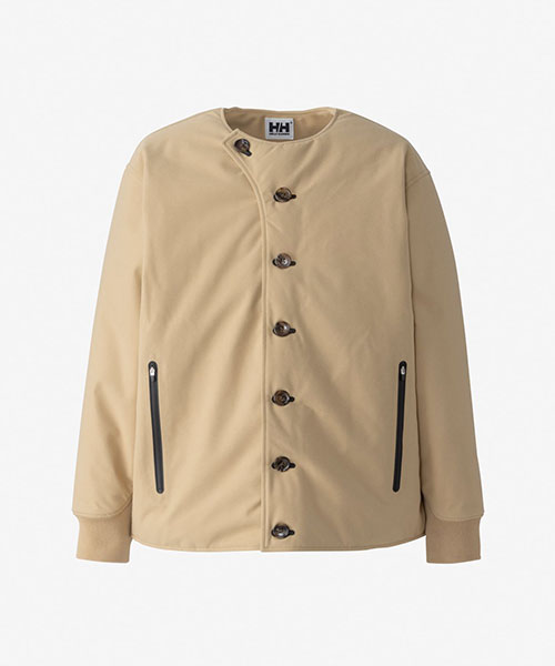 海の服の歴史を刻むHELLY HANSENが手がける、海のロマンを詰め込んだワークウエアコレクション「ROYAL MARINE CLUB(ロイヤル マリン クラブ)(R.M.C)」のインサレーションジャケット。クラシカルなデザイン×現代テクノロジーを融合させたアイテムです。1990年代に展開していたHELLY HANSENのアーカイブアイテムから着想したデザイン。トップがフラップ状になった前立てデザインが特徴的で、ボタンを締め込むと防風性が高まります。素材には現代的なテクノロジーを取り入れており、表地にはナチュラルな風合いで高い防風性のあるWINDSTOPPER products by GORE-TEX LABSを採用。表地には防水性があり、さらに裏地にはっ水加工を施しているため、多少の雨なら対応できます。封入した中わたにもこだわり、ダウン素材のほか、木の実から採れる軽くて暖かい中わた素材のカポックなどを使用。このカポックを含むTHINDOWNという板状の中わたダウンを使用することでコールドスポットができにくく、少ない中わた量でも高い保温性をもたらします。ステッチレスの中わた仕様だけでなく、ボタンホールをインフュージョン仕様にすることで、縫い目から水が入るのを軽減できるだけでなく、さらにコールドスポットが少なくなるようにしました。