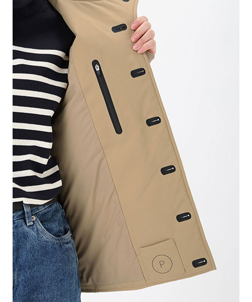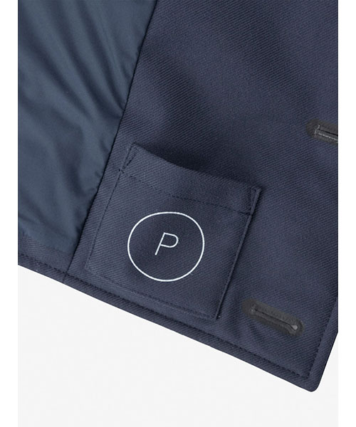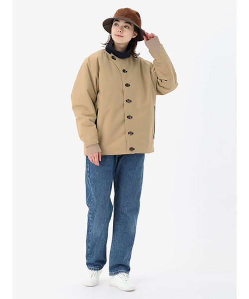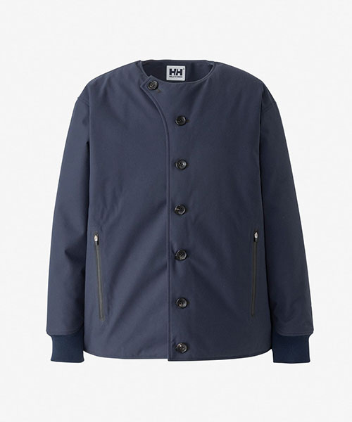 海の服の歴史を刻むHELLY HANSENが手がける、海のロマンを詰め込んだワークウエアコレクション「ROYAL MARINE CLUB(ロイヤル マリン クラブ)(R.M.C)」のインサレーションジャケット。クラシカルなデザイン×現代テクノロジーを融合させたアイテムです。1990年代に展開していたHELLY HANSENのアーカイブアイテムから着想したデザイン。トップがフラップ状になった前立てデザインが特徴的で、ボタンを締め込むと防風性が高まります。素材には現代的なテクノロジーを取り入れており、表地にはナチュラルな風合いで高い防風性のあるWINDSTOPPER products by GORE-TEX LABSを採用。表地には防水性があり、さらに裏地にはっ水加工を施しているため、多少の雨なら対応できます。封入した中わたにもこだわり、ダウン素材のほか、木の実から採れる軽くて暖かい中わた素材のカポックなどを使用。このカポックを含むTHINDOWNという板状の中わたダウンを使用することでコールドスポットができにくく、少ない中わた量でも高い保温性をもたらします。ステッチレスの中わた仕様だけでなく、ボタンホールをインフュージョン仕様にすることで、縫い目から水が入るのを軽減できるだけでなく、さらにコールドスポットが少なくなるようにしました。