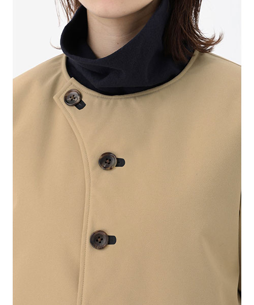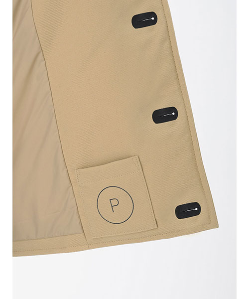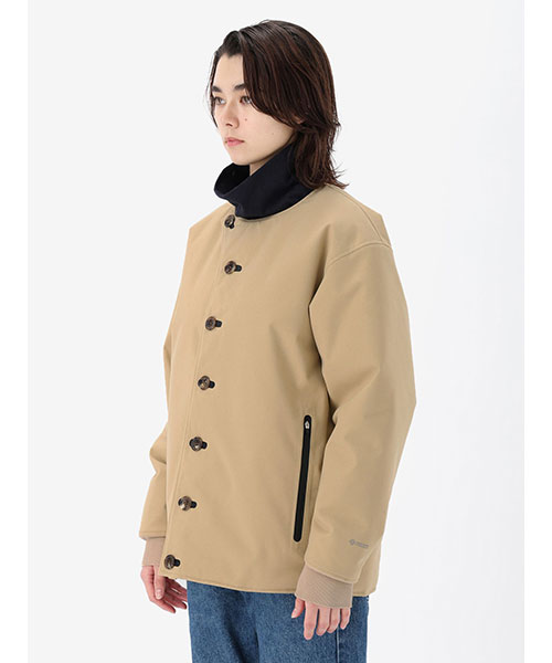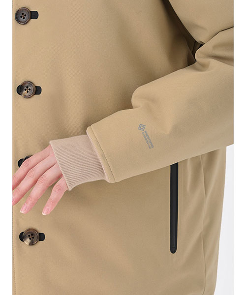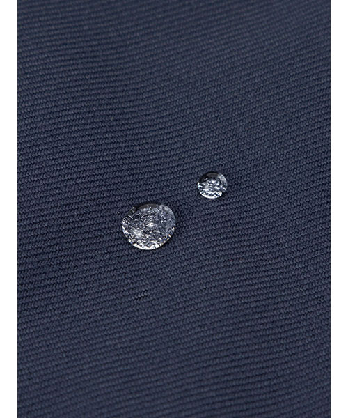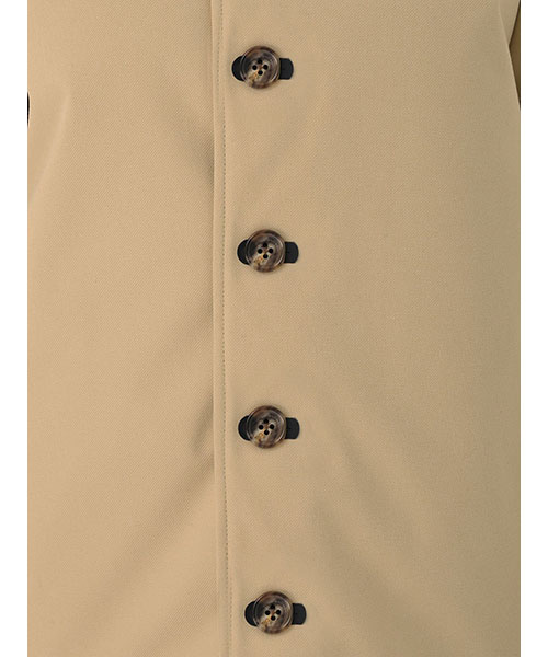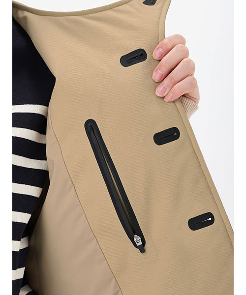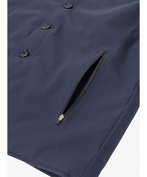 フロントのボタンは、高級感があり強度も高い水牛ボタンを採用。袖口は、リブのVガゼットのデザイン。両腰のポケットは止水ファスナー仕様です。