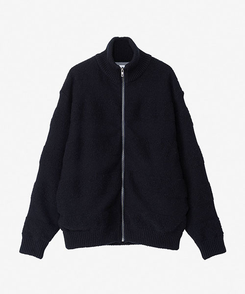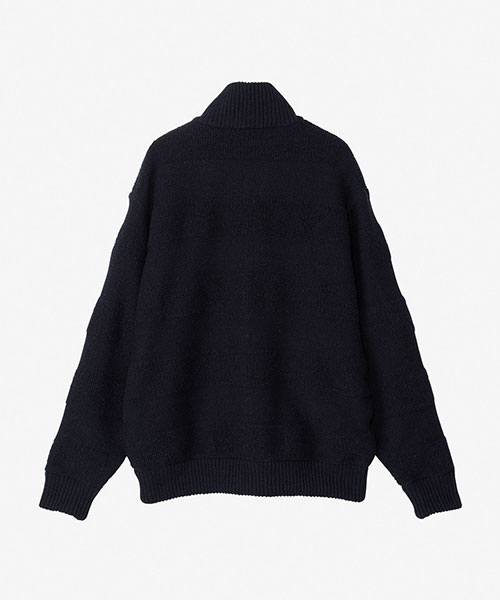 フロントの金属調のファスナーがさりげないポイントになる、ドライバーズニットのデザイン。2種類の編み方を交互に組み合わせることで、凹凸感のあるボーダー柄を表現しています。首に沿うようなハイネック仕様で、セーターとしてもアウターとしても着やすい、ゆったりとしたシルエットで仕上げました。環境への負荷に配慮して、素材の一部にリサイクル糸を使用しています。