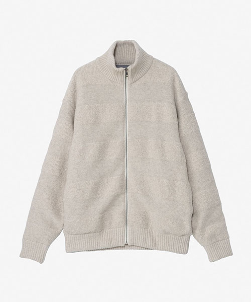 フロントの金属調のファスナーがさりげないポイントになる、ドライバーズニットのデザイン。2種類の編み方を交互に組み合わせることで、凹凸感のあるボーダー柄を表現しています。首に沿うようなハイネック仕様で、セーターとしてもアウターとしても着やすい、ゆったりとしたシルエットで仕上げました。環境への負荷に配慮して、素材の一部にリサイクル糸を使用しています。