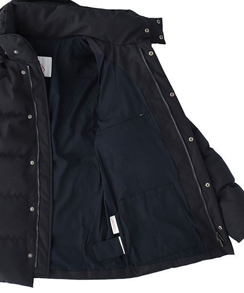 ミドルレングスでビジネスシーンでも着用できる万能アウターの「ベルフォール」は、高密度に織られたポリエステルのギャバジンにキルトステッチを施したシンプルなデザインのジャケットです。フロントボタンは表から隠れて見えない仕様にし、着脱可能なフードにはファーを取り付けないことで、コーディネートがしやすいシンプルなデザインになっています。