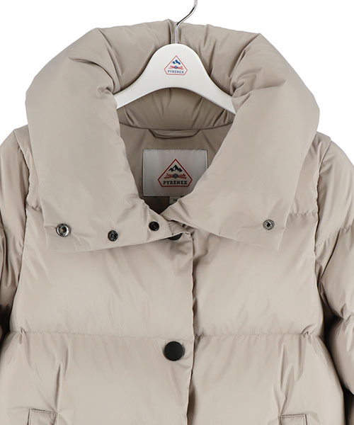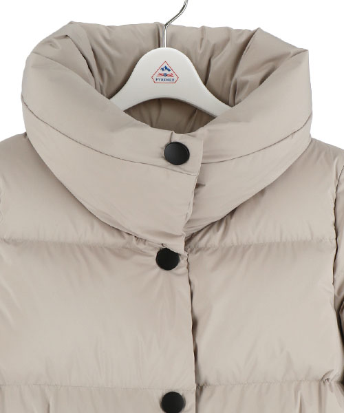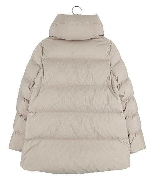 ボリュームのある襟元とフロントのドットボタンがアクセントとなったミドルレングスの「エローラ」。ややドロップした肩と細すぎない袖幅で全体的にゆとりがあるリラックスしたシルエットです。フレンチダックダウンをしっかりと詰め立体的に仕上げた襟は、一番上のボタンを閉じることで襟が立ち上がりマフラー代わりにもなります。また前後差を付けた裾をラウンドさせて全体的に柔らかい印象のダウンジャケットに仕上げています。BRAND CONCEPT