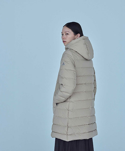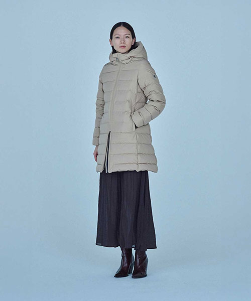 贅沢に使用した高品質フレンチダックダウンとロング丈でしっかり防寒しつつも、ダウン特有のボリューム感を抑えたすっきりシルエットに仕上げました。