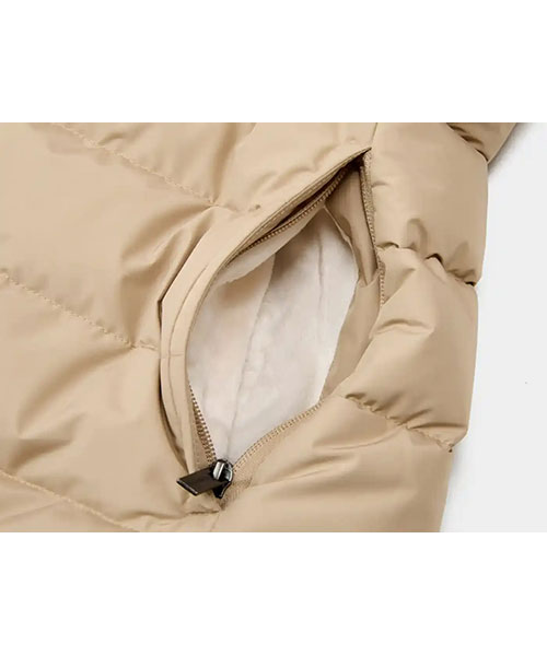 高めの襟と固定フードが首元をしっかりカバーし、フロントはダブルジップ仕様で足さばきも良く、両サイドのジップポケットには、手を入れた瞬間ほっとするフリースライニングを施し、冷たい外気の日にも嬉しいディテールに。