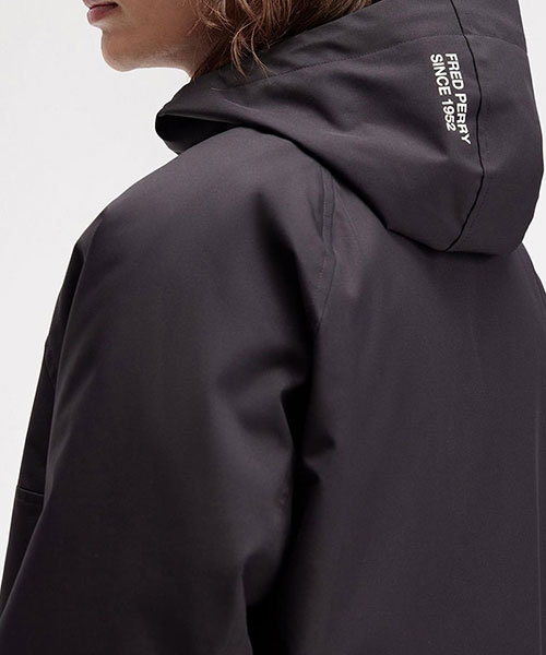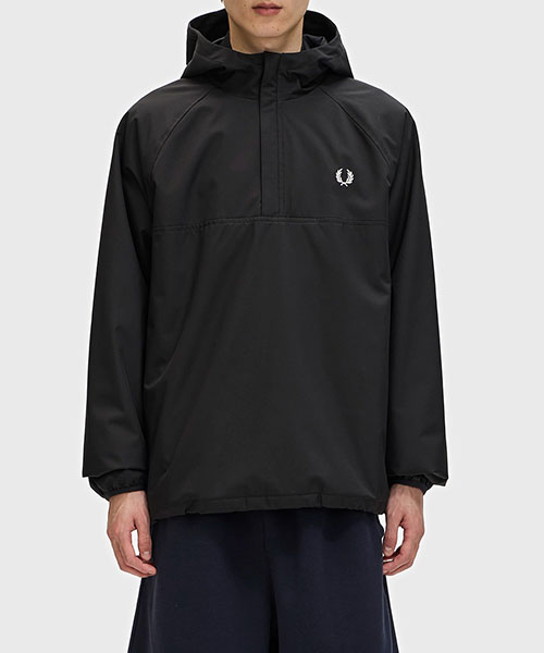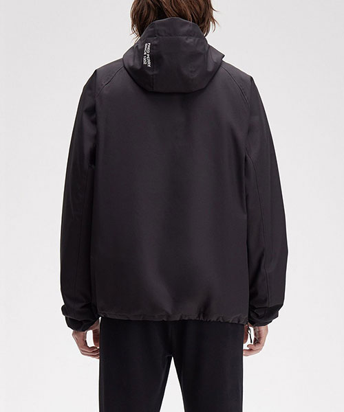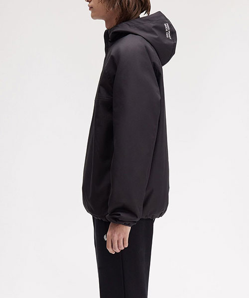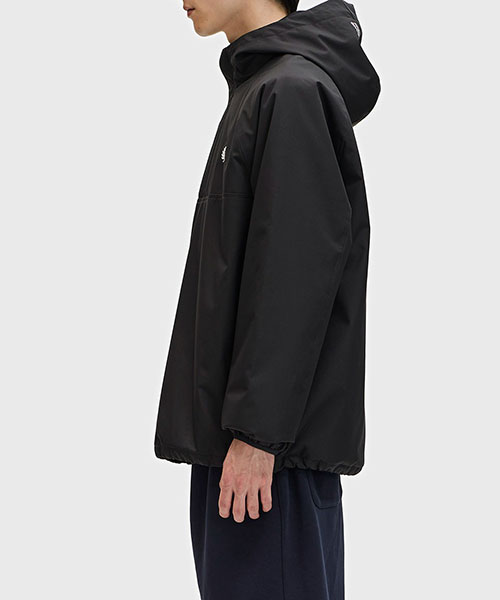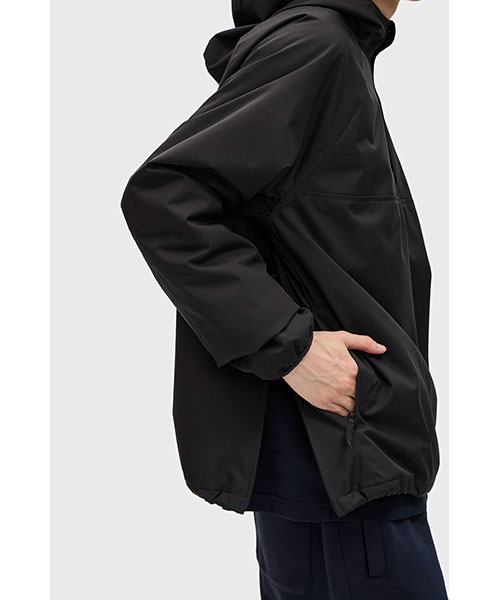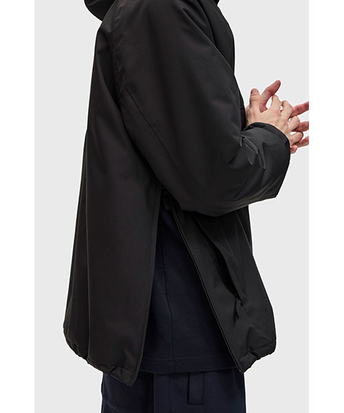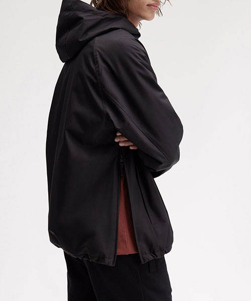 100%リサイクルポリエステルを使用したスモックジャケット。やや光沢のあるきれいめな表面感のポリエステルに薄手の中綿を配し、ネック部分にはティップライン入りのリブ、サイドにはファスナー開閉のスリット、前面には大きめのカンガルーポケットを備えています。BRAND CONCEPT
