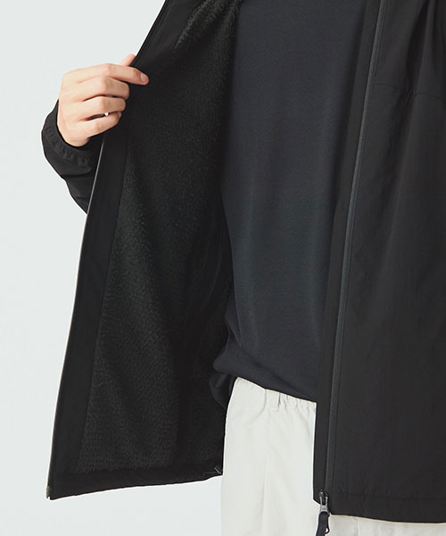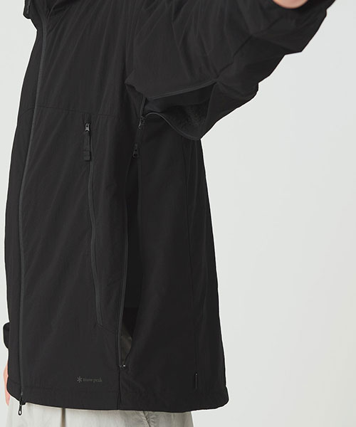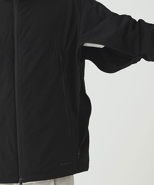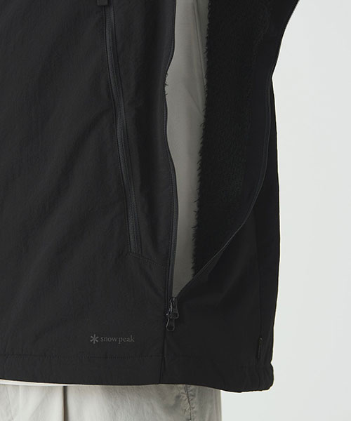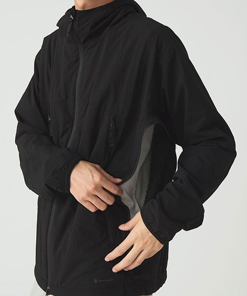 脇には、ダブルファスナースライダーで利便性を向上した大型のポケットを配置。内側の袋布にポーラテックアルファダイレクトを使用し、ファスナーを開けておけばベンチレーションとして、手を入れた際はウォームポケットとして機能します。フード・袖口はゴム仕様で、風や冷気の侵入を防止。裾に配したドローコードで、シルエット調整と風・冷気の侵入を防ぎます。「Snow Peak」ロゴのワンポイントが効いたシンプルなデザインです。