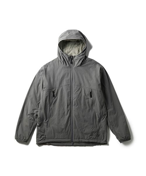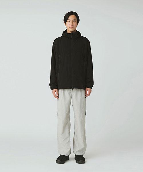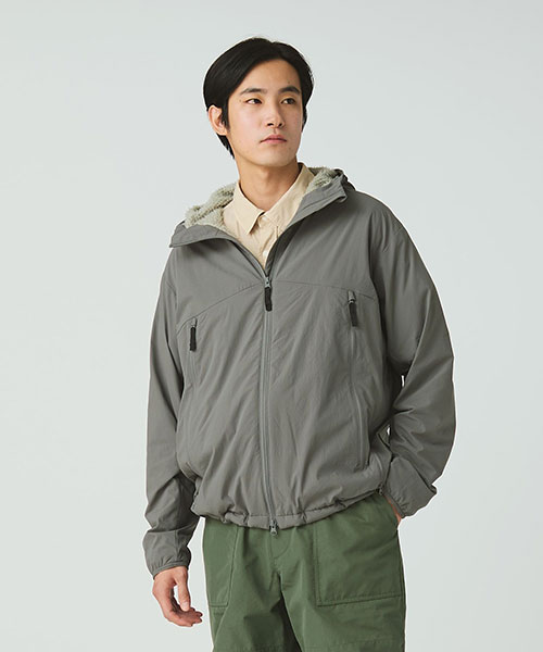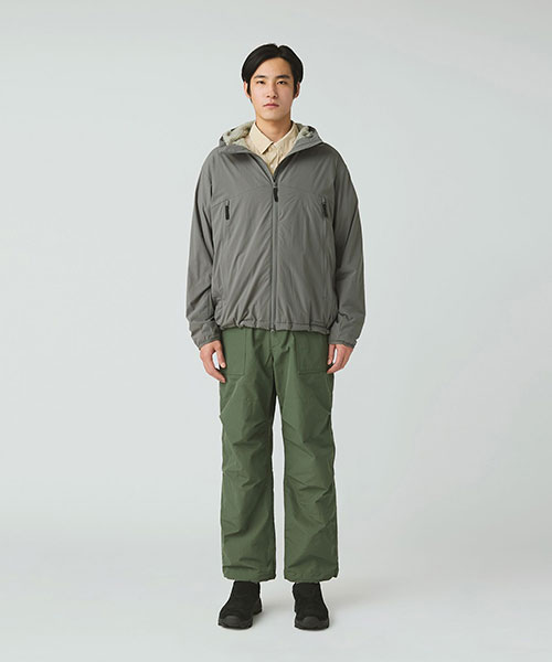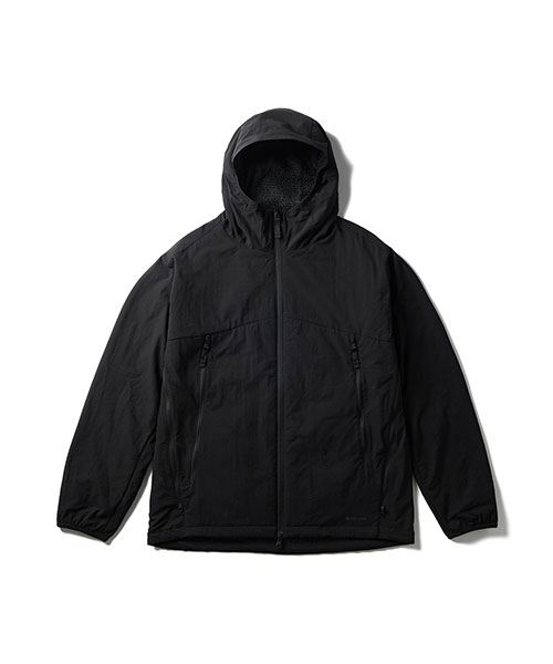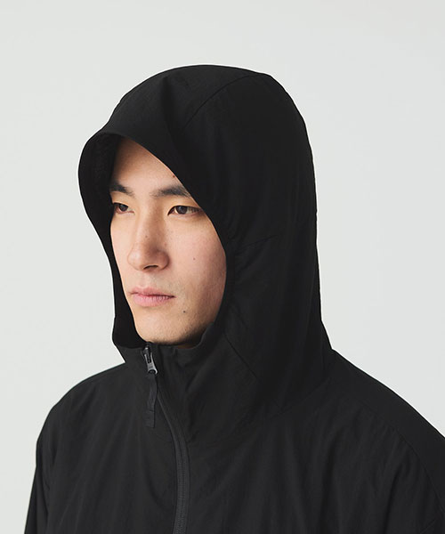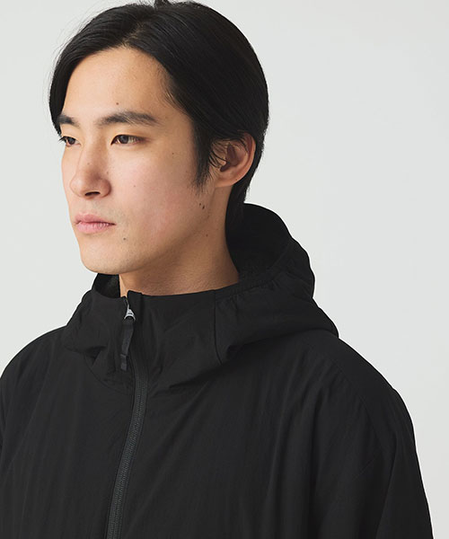 保温性と通気性、4wayストレッチ性を兼ね備えた、呼吸するミドルアウターシリーズ秋・春にはアウターウェアとして、冬にはミドラーとして、気温の変化により使い分けられる万能な軽量フーデッドジャケット。体の熱をコントロールするのに最適な素材選定とディテールワークで、呼吸するミドルアウターのコンセプトを実現します。ポーラテック社の最軽量アルファダイレクト(67g/m2)を裏に採用。保温性を備えつつ、メッシュ構造により高い通気性を発揮し、熱気や湿気がこもることなく快適な着心地を味わえます。表地には、光沢を抑えたミニリップストップ素材を採用しています。あえてコーティング等を施さないことで、軽さやしなやかさ、ストレッチ性を活かしています。環境に配慮したC0撥水も施されています。