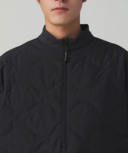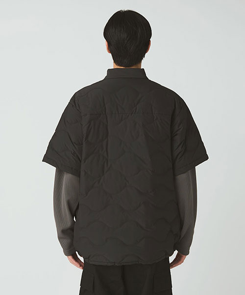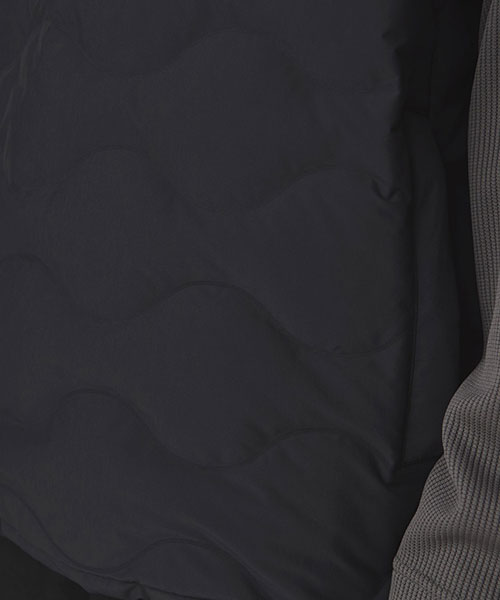 高密度の2枚の素材をミリタリーキルトデザインで接結させてストレッチを効かせた、オリジナル素材を使用しています。中わたには700フィルパワーの撥水ダウンを用いて、表地にも環境配慮のC0撥水を施し、ダウン特有の濡れることで生じる保温力の低下をカバー。また家庭洗濯も可能にしました。生地は横向きにストレッチするため、ダウンウェア特有の動きづらさや窮屈さを感じません。