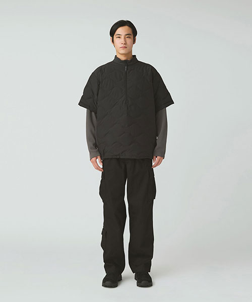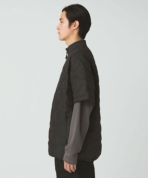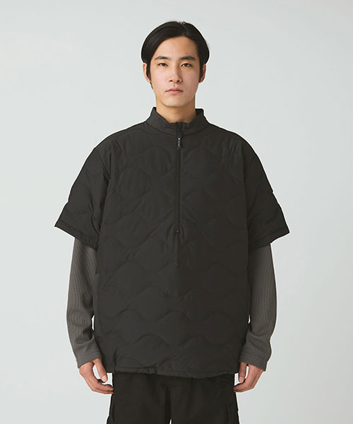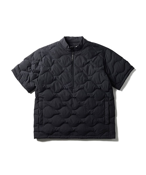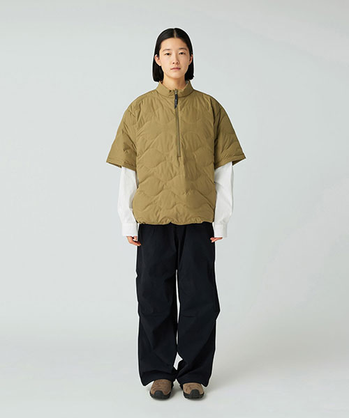 肌寒い春と秋、そして冬にも活躍の万能な半袖ダウンプルオーバー。暖かさをキープしながら、袖丈を短くすることで動きやすさも兼ね備えました。裾のドローコードを使い、風の侵入を防ぐとともにシルエット調整もできます。左右脇ポケットの配置によって、アウターとしての機能も搭載。ネックファスナーの開閉はベンチレーションの役割を果たし、レイヤードスタイルも自由に楽しめます。