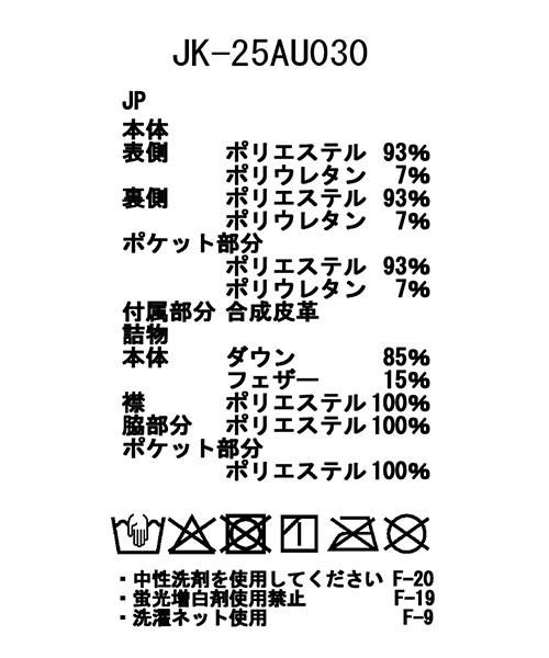 素材 | (BODY)FACE:93% POLYESTER,7% SPANDEX/BACK:93% POLYESTER,7% SPANDEX/POCKET:93% POLYESTER,7% SPANDEX/ACCESSORY:IMITATION LEATHER/FILLING BODY:DOWN(MINIMUM 85% DOWN)/COLLAR:100% POLYESTER/SIDE PART:100% POLYESTER/POCKET:100%POLYESTER |