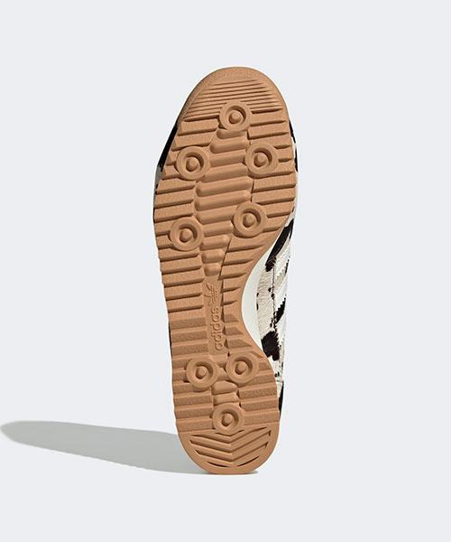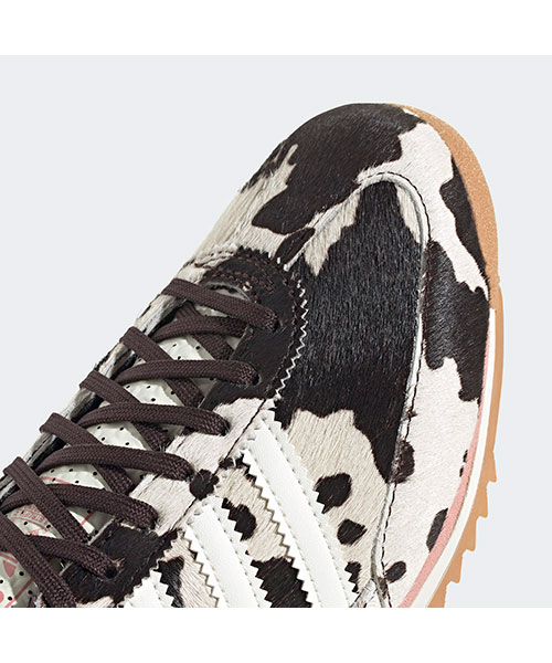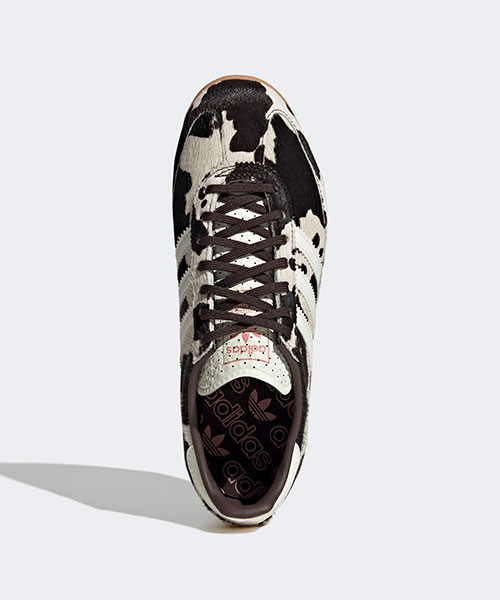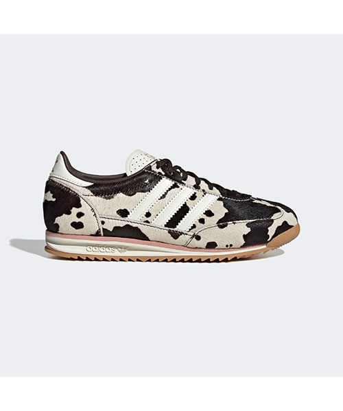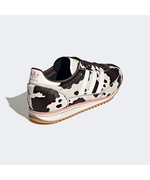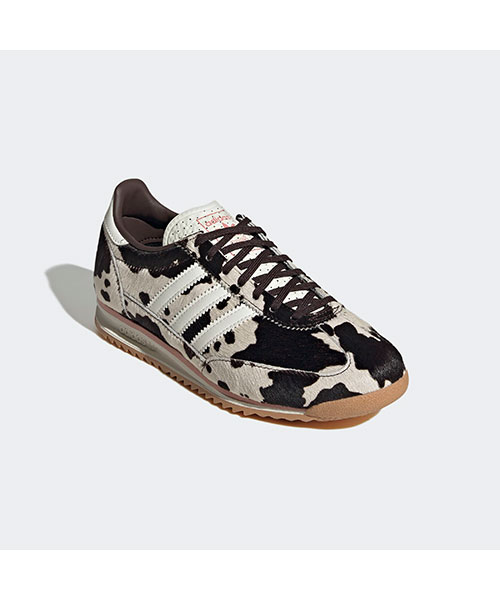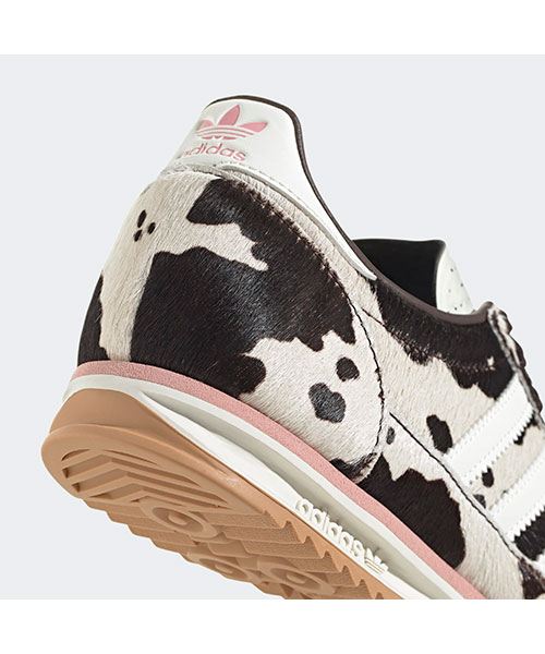 超軽量構造でランニングシューズに革命を起こした1972年発表のSL 72。この普段使いのadidasシューズは、牛にインスピレーションを得たプリントとポニーヘアが特徴で、愛敬のあるルックスを再現。