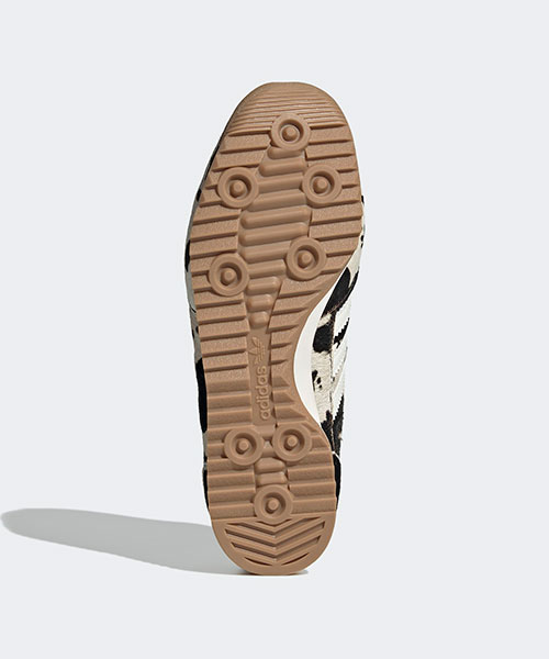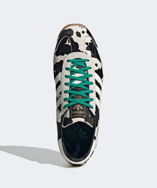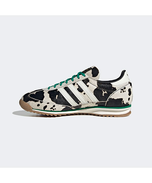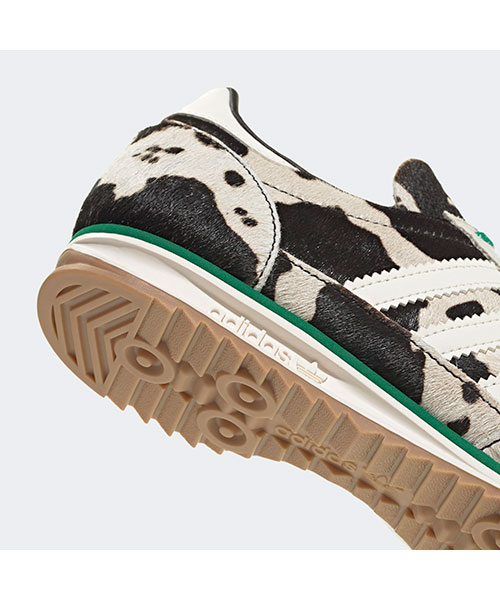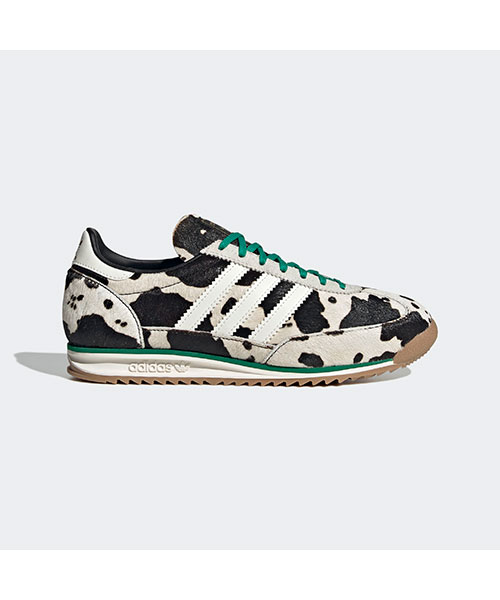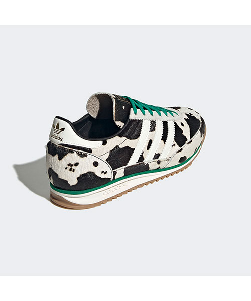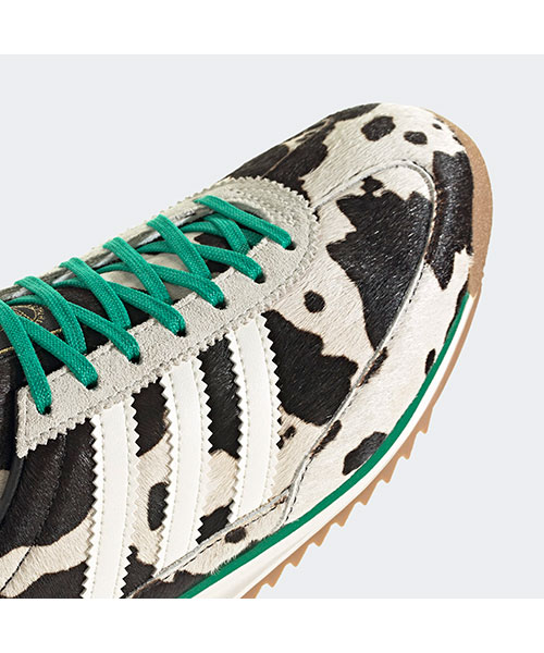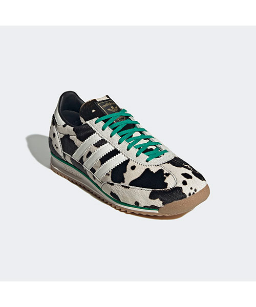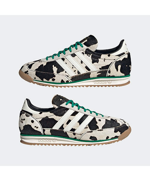 超軽量構造でランニングシューズに革命を起こした1972年発表のSL 72。この普段使いのadidasシューズは、牛にインスピレーションを得たプリントとポニーヘアが特徴で、愛敬のあるルックスを再現。