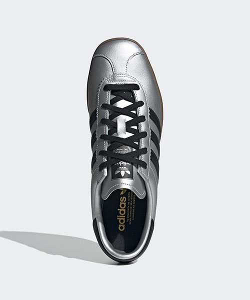 ギザギザのスリーストライプスとそれにマッチしたヒールタブ、クラシックな文字入りのディテールがアイコニックなイメージを完成させる。