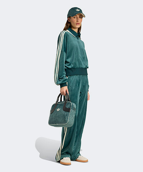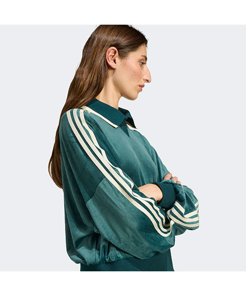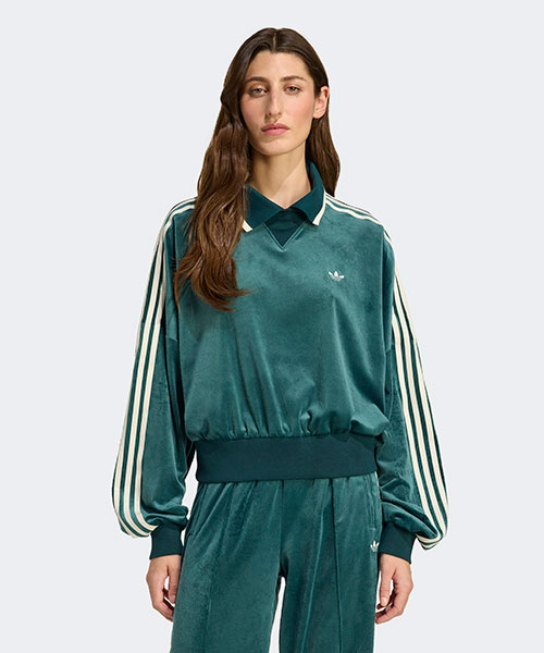 adidas OriginalsとLiberty Londonのコラボレーションにより、それぞれのアイコニックで伝統的なスタイルを鮮やかでカラフルな方法で融合させる。柔らかいベルベット生地を使用し、胸元にさりげなくエンボス加工されたトレフォイルのロゴがあしらわれたスウェットシャツ。