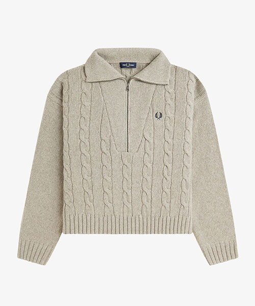 ウールナイロン素材を使用したケーブルニットトップス。深めのハーフジップに大きめな衿が特徴です。BRAND CONCEPT