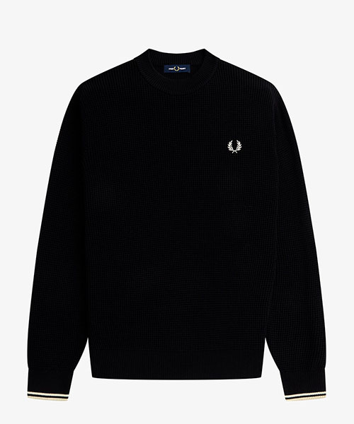 上質なコットンを使用したミドルゲージのワッフル編みクルーネックニット。 袖口にはローレルリース刺繍と連動したカラーでティップラインを施しています。BRAND CONCEPT