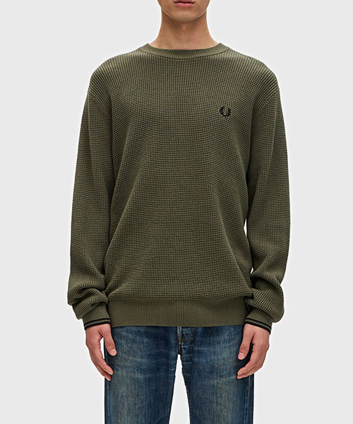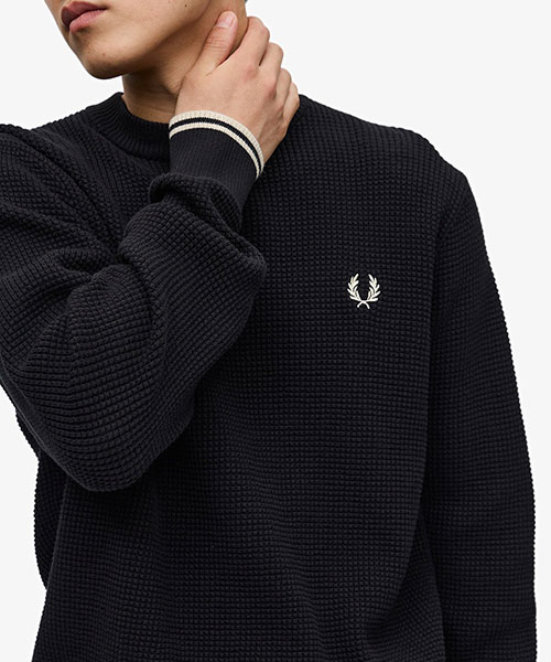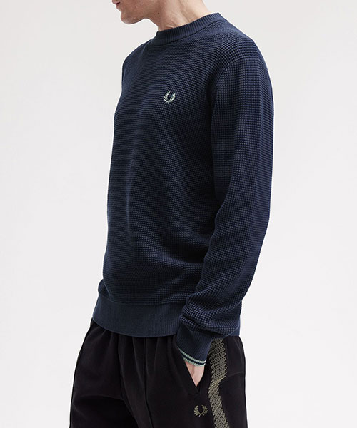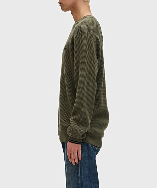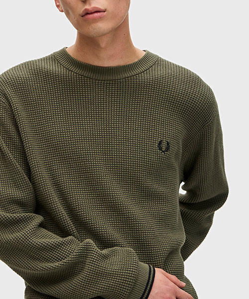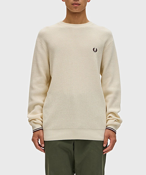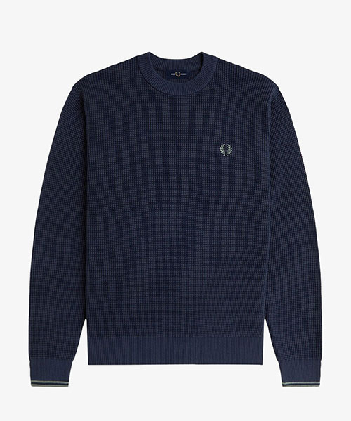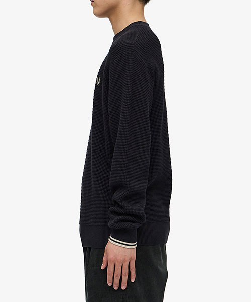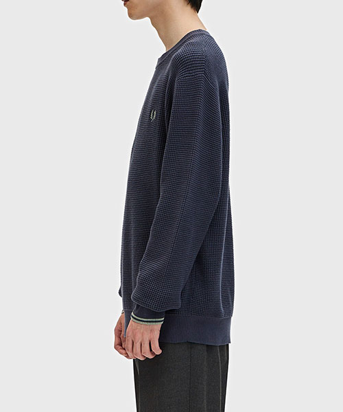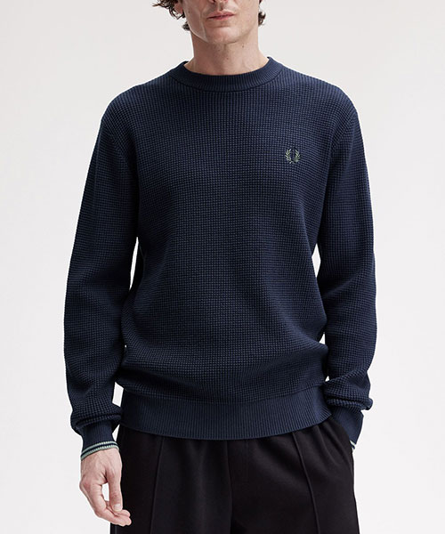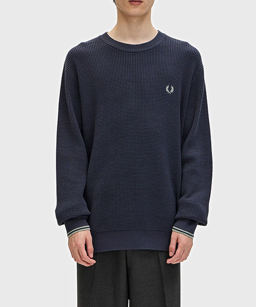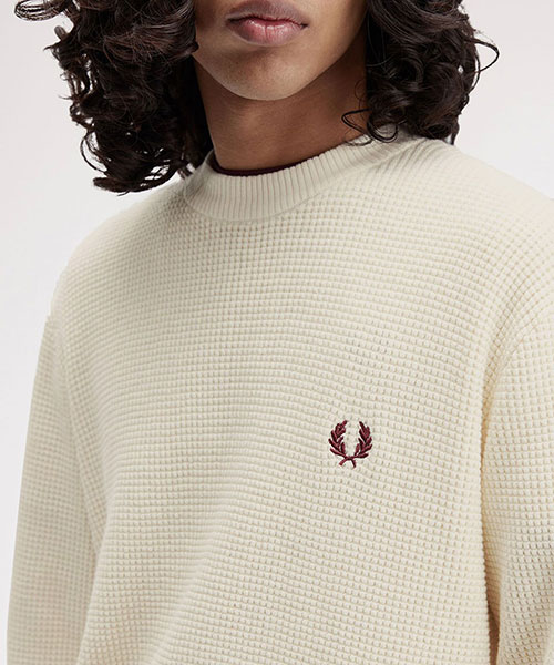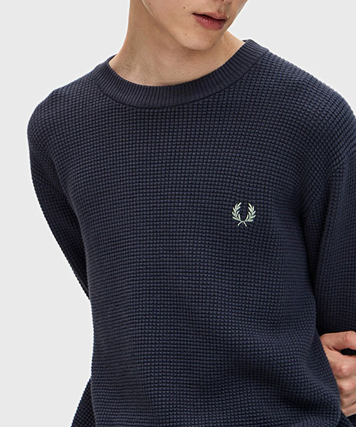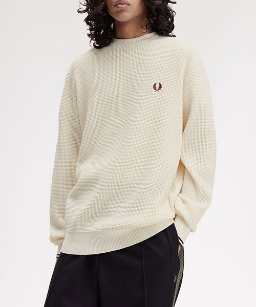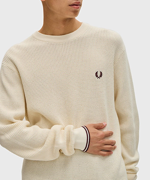 上質なコットンを使用したミドルゲージのワッフル編みクルーネックニット。 袖口にはローレルリース刺繍と連動したカラーでティップラインを施しています。BRAND CONCEPT