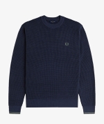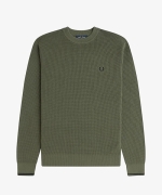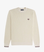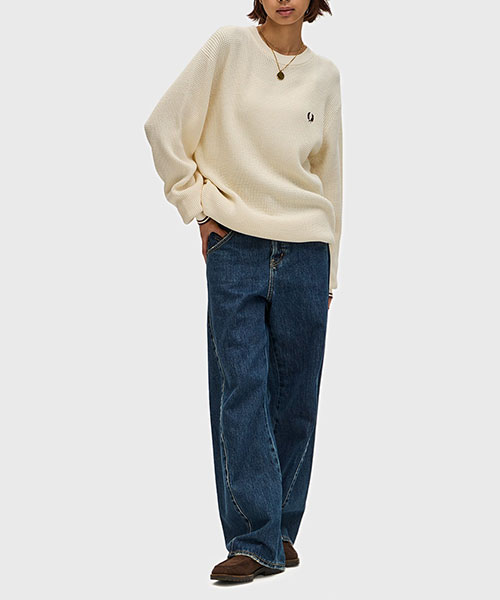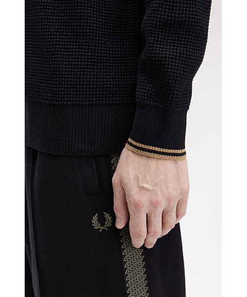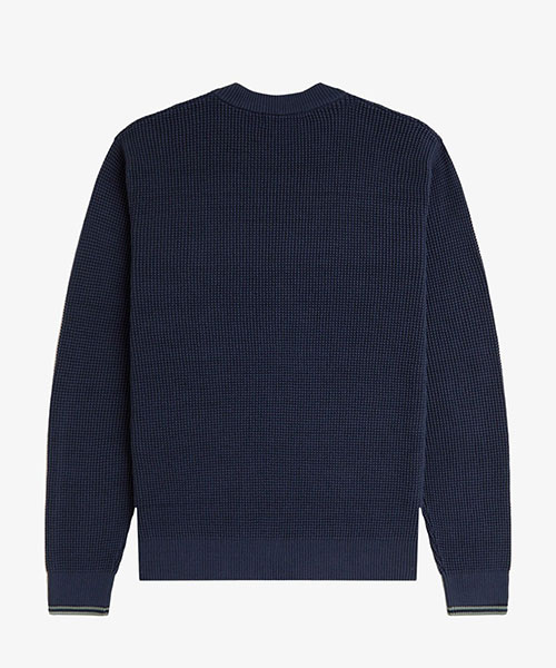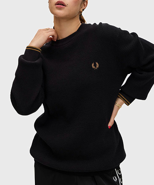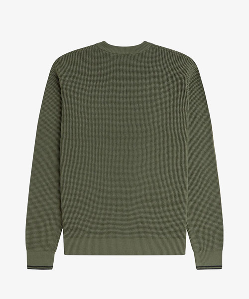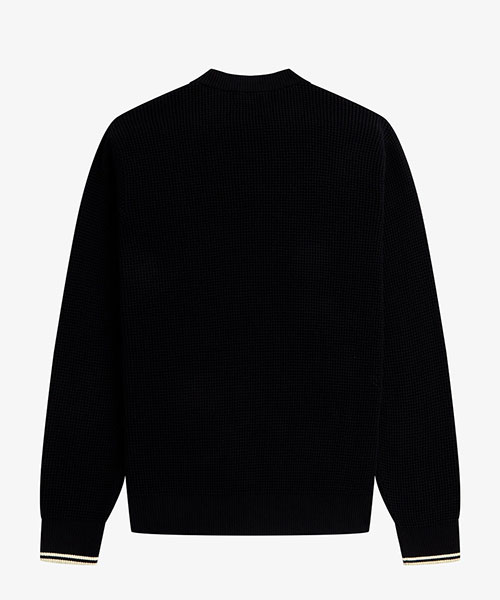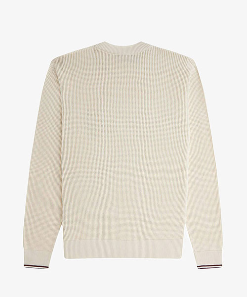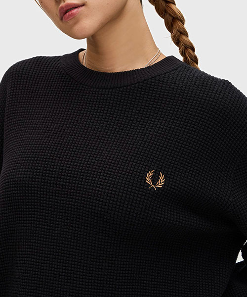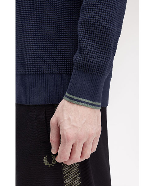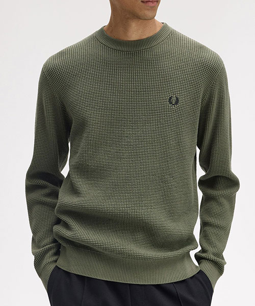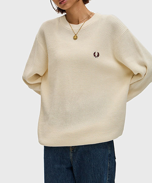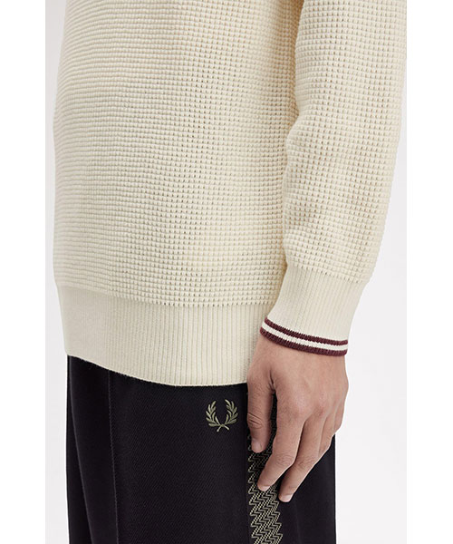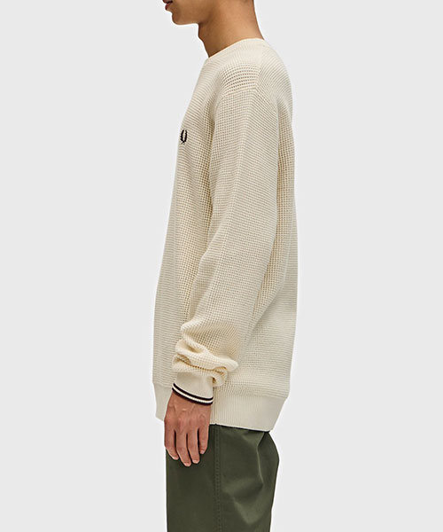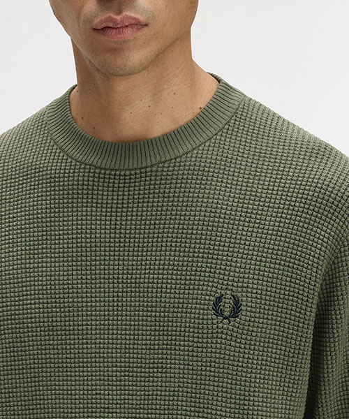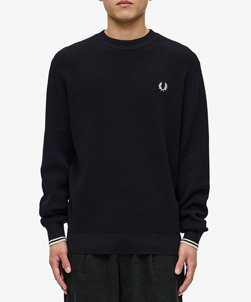 上質なコットンを使用したミドルゲージのワッフル編みクルーネックニット。 袖口にはローレルリース刺繍と連動したカラーでティップラインを施しています。BRAND CONCEPT