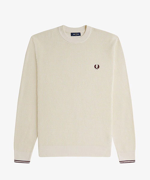 上質なコットンを使用したミドルゲージのワッフル編みクルーネックニット。 袖口にはローレルリース刺繍と連動したカラーでティップラインを施しています。BRAND CONCEPT