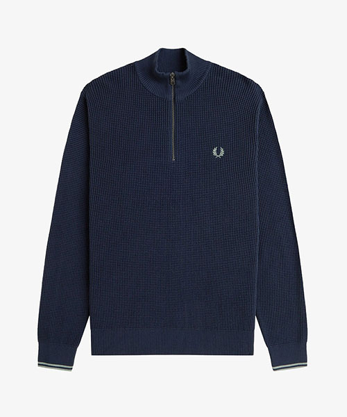 上質なコットンを使用したミドルゲージのワッフル編みのハーフジップニット。袖口にはローレル刺繍と同色のティップラインをあしらい、アクセントにしています。BRAND CONCEPT