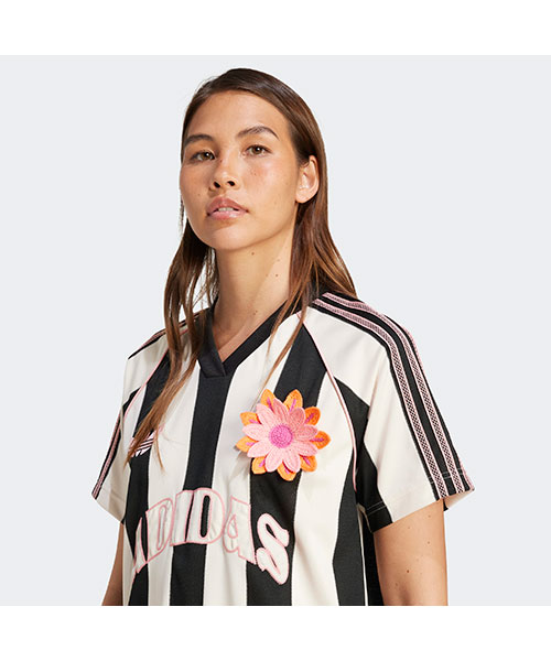 クロシェ編みで施したスリーストライプスとフラワーバッジ、胸にチェーンステッチでadidasのグラフィックをあしらっている。
