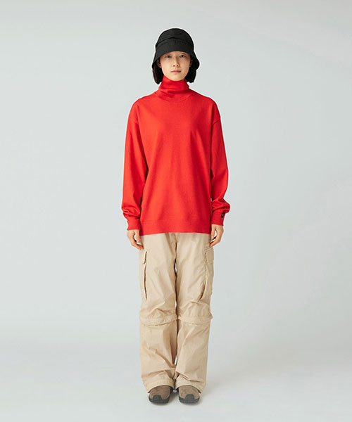 きれいめのスタイリングからアウトドアまで。多彩なシーンで着回し可能な実力派ニット。ゆったりとしたリラックスシルエットで、肩の力が抜けた着こなしを叶えてくれるタートルネックニット。衿元をくしゅっとさせることができる、オフタートル風のデザインも特徴的です。オフショルダーのディテールやリラックスフィットのシルエットが、トレンド感を演出してくれる1着です。肩部分は、肌あたりを軽減させるため特殊なリンキング加工を施しました。飽きのこないシンプルな無地で、トラウザーズと合わせたキレイめのスタイリングから「TAKIBI」シリーズのトップスと合わせたアウトドアスタイルまで、幅広く着回しが可能。折り返し仕様の袖口はサムホール付きで、グローブを着用しなくても手の甲部分まで温めてくれます。