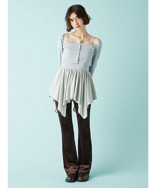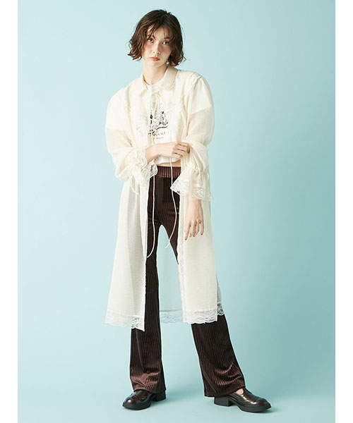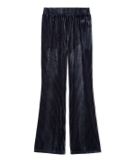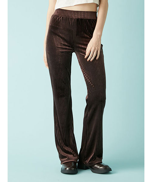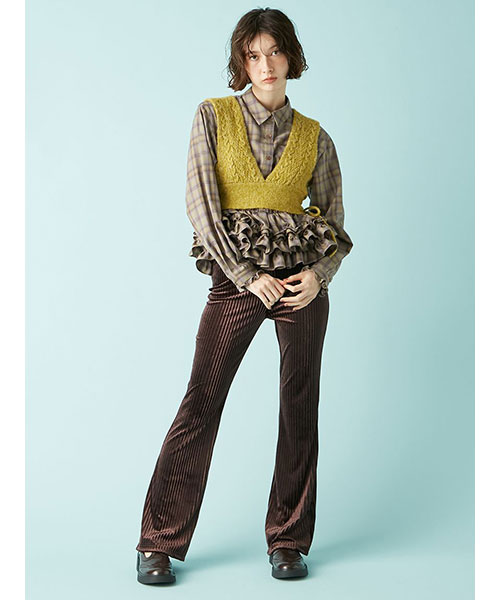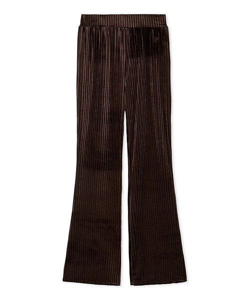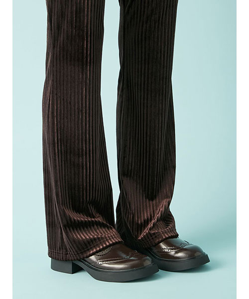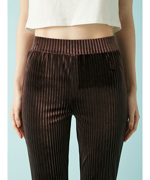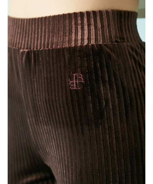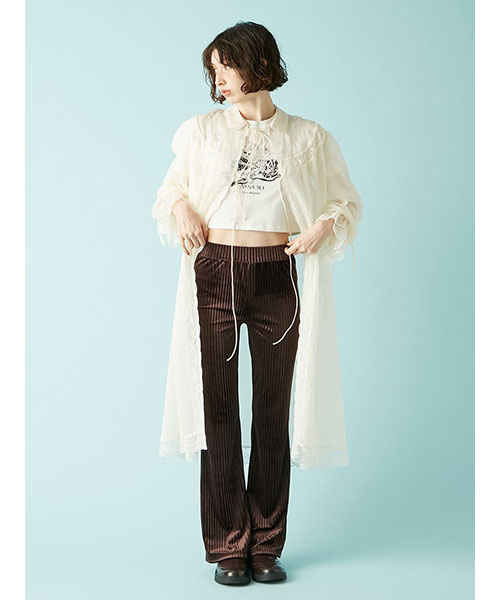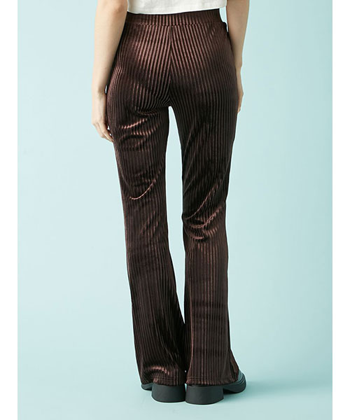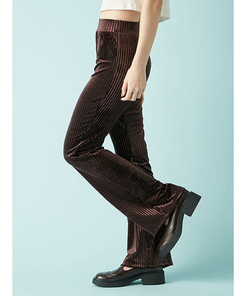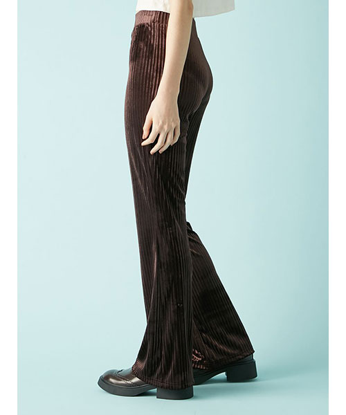 裾に向かって広がるフレアラインが、脚をすらりと長く見せてくれる美脚パンツ。左脇には「LILY BROWN」オリジナルのロゴ刺繍をあしらい、さりげないアクセントに。ウエストはぐるりと一周ゴム仕様で、リラックスした穿き心地ときちんと感を両立しました。