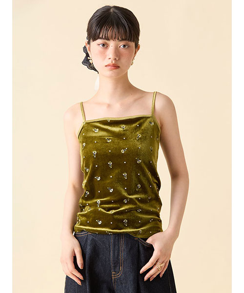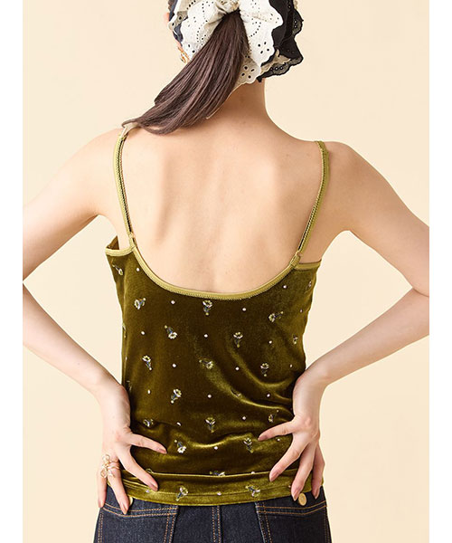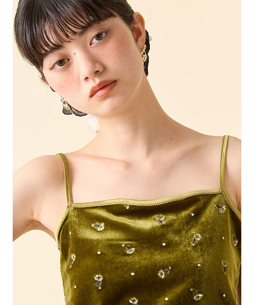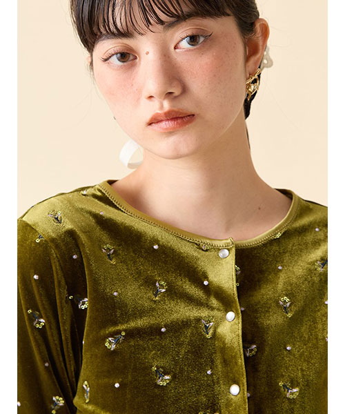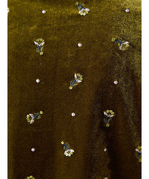 伸縮性のあるベロア素材に、繊細な刺繍とスパンコールのきらめきをプラスしました。