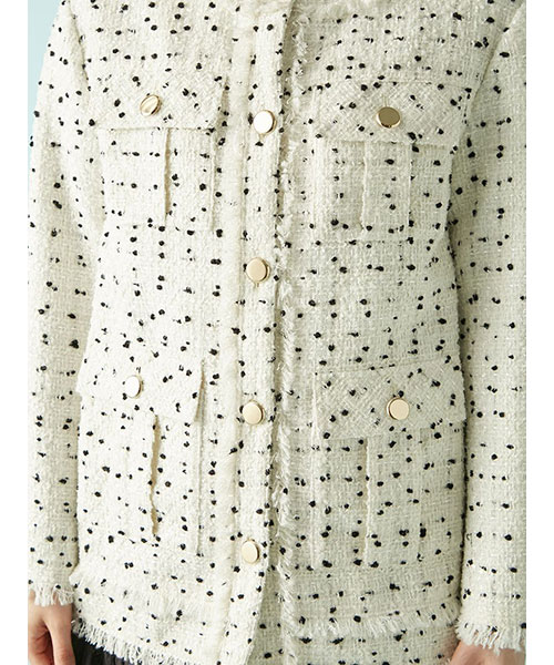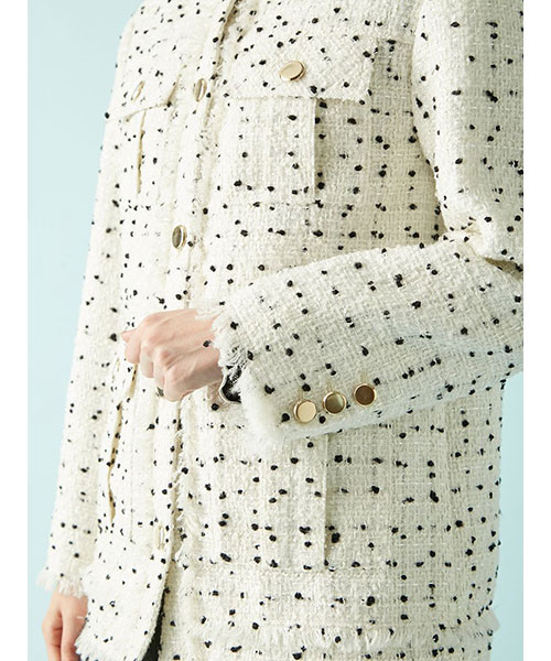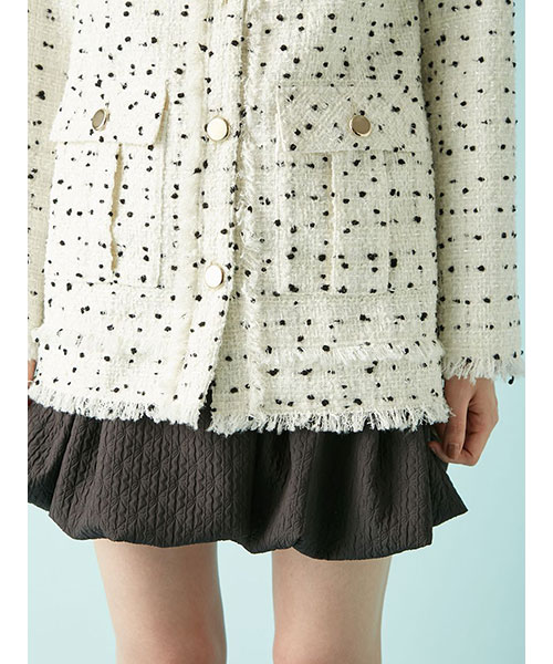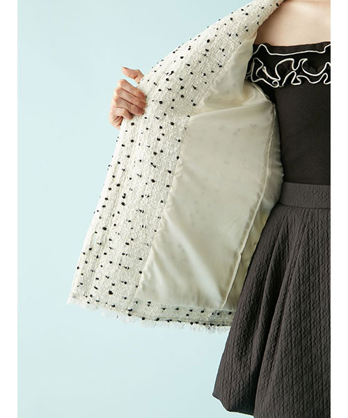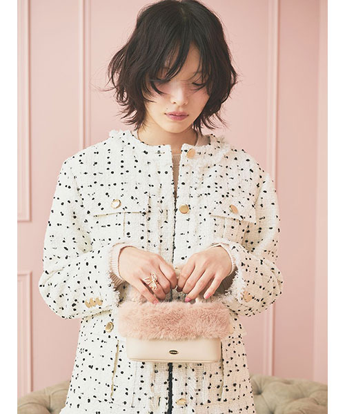 それぞれのカラーごとに糸の組み合わせを変えたオリジナルのツイード生地を使用。立体感と奥行きのある表情が魅力で、シーズンムードを高めてくれます。ホワイトはランダムなドット見えの華やかさ、ブラウンは淡いラベンダーやピンクを織り交ぜた甘めのトーン、ブラックは薄めのゴールド糸を取り入れた上品な表情に仕上げました。