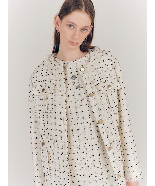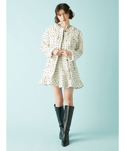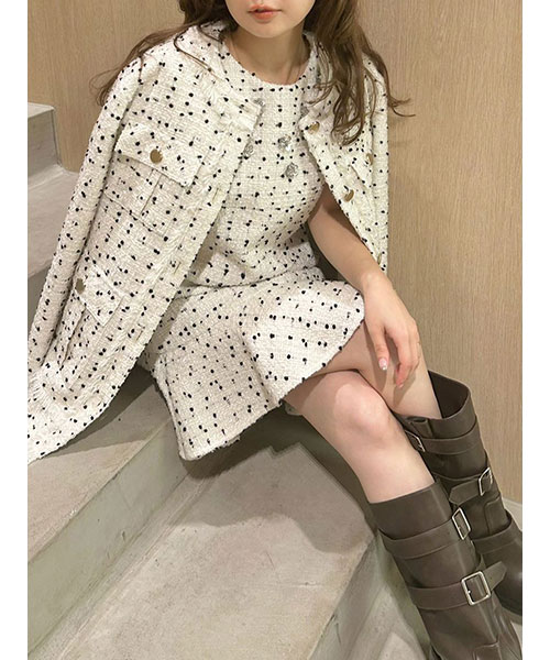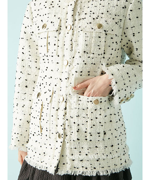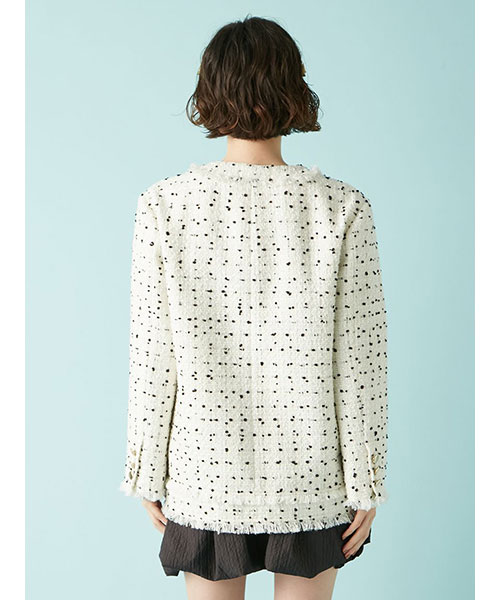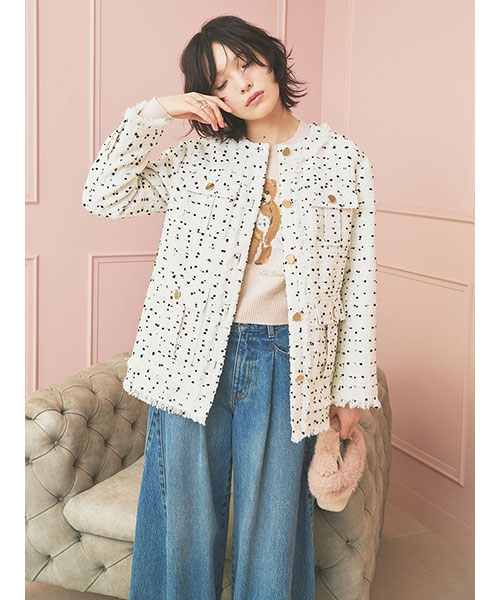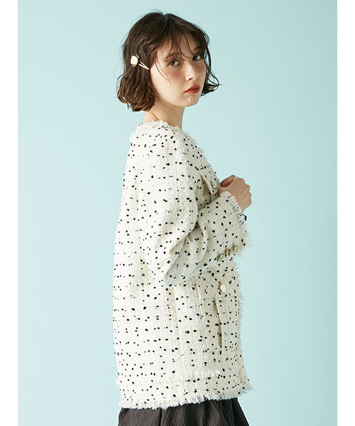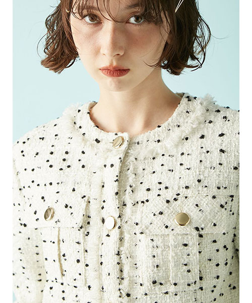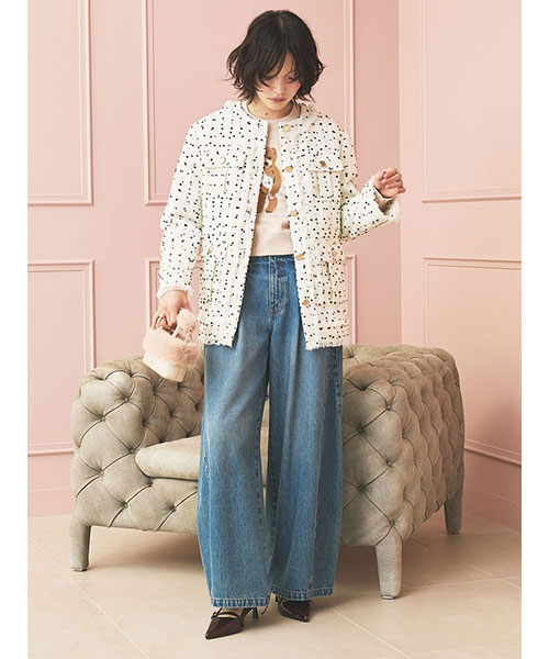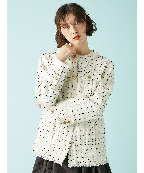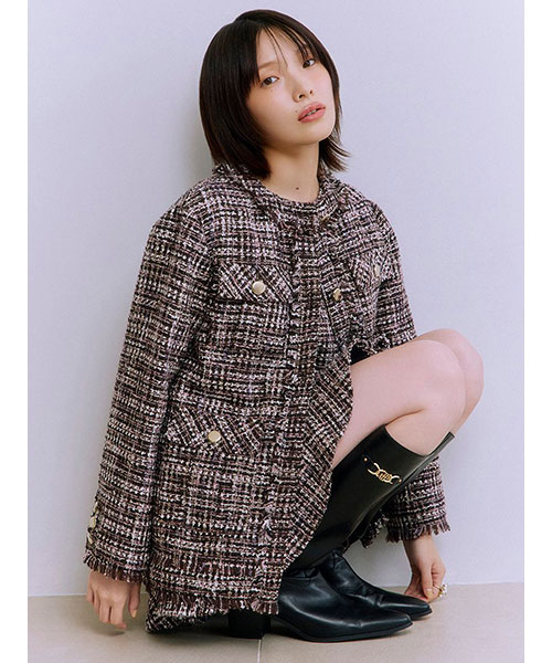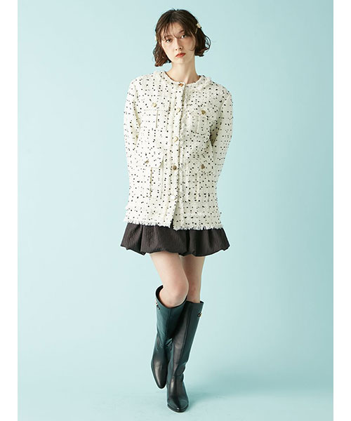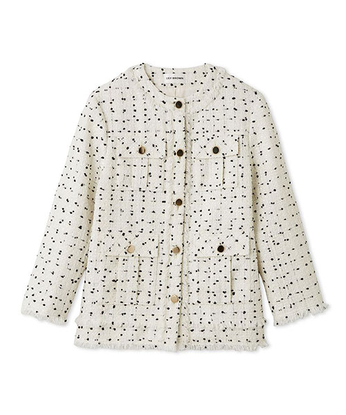 毎年人気のツイードジャケットが今季も登場。それぞれ異なる糸を使用して雰囲気の異なる3柄のバリエーションで展開しています。程よいオーバーサイズシルエットで、こなれ感のある着こなしが叶います。デニムパンツとのカジュアルミックスや、同素材のAラインミニワンピース(LWFO254808)とセットでの着用もおすすめです。