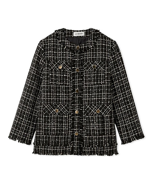 毎年人気のツイードジャケットが今季も登場。それぞれ異なる糸を使用して雰囲気の異なる3柄のバリエーションで展開しています。程よいオーバーサイズシルエットで、こなれ感のある着こなしが叶います。デニムパンツとのカジュアルミックスや、同素材のAラインミニワンピース(LWFO254808)とセットでの着用もおすすめです。