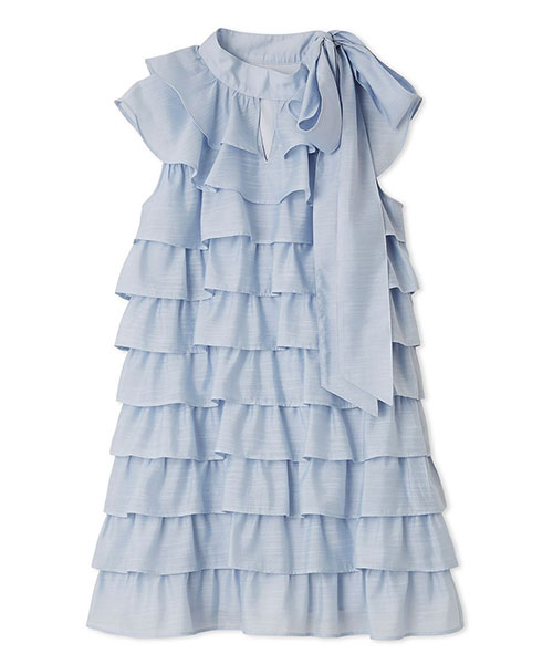 たっぷりのティアードフリルが目を惹く、華やかなミニドレス。ふんわりとしたボリューム感のあるシルエットながら、土台となるワンピース部分でウエストをさりげなくシェイプすることで、360度どこから見てもすっきり見えるAラインに仕上げました。サイドに添えたボウタイリボンがレディなムードを後押し。デイリーの主役ワンピとしてはもちろん、ちょっとしたお呼ばれにも活躍する一着です。