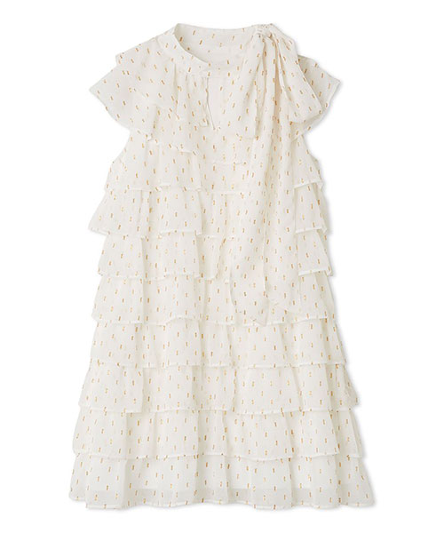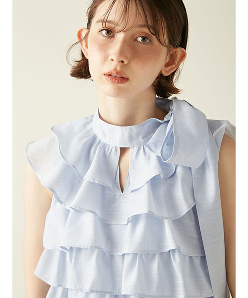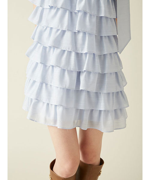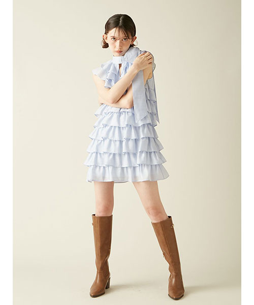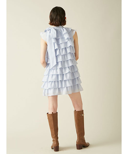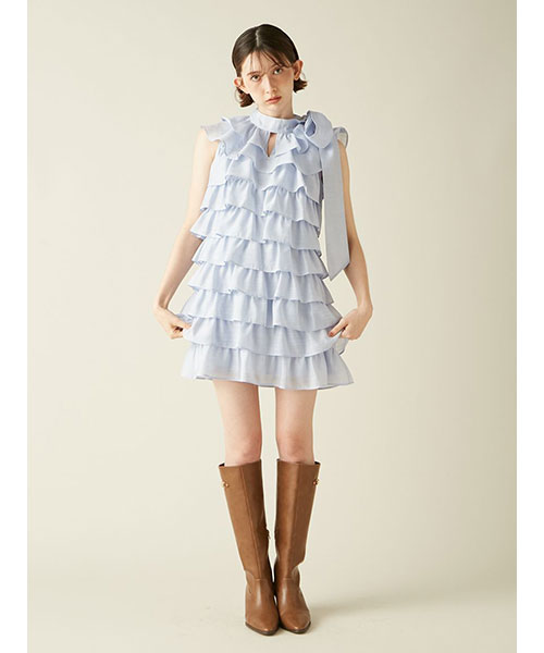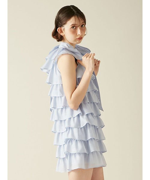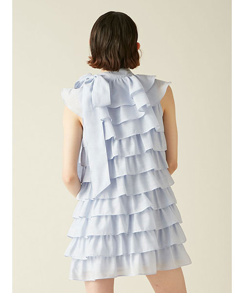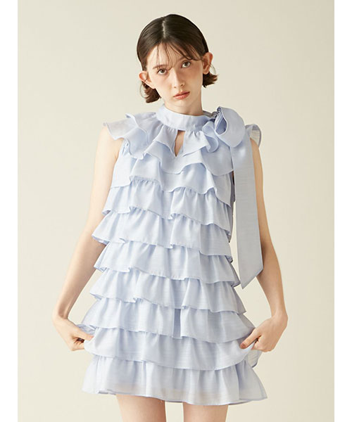 たっぷりのティアードフリルが目を惹く、華やかなミニドレス。ふんわりとしたボリューム感のあるシルエットながら、土台となるワンピース部分でウエストをさりげなくシェイプすることで、360度どこから見てもすっきり見えるAラインに仕上げました。サイドに添えたボウタイリボンがレディなムードを後押し。デイリーの主役ワンピとしてはもちろん、ちょっとしたお呼ばれにも活躍する一着です。