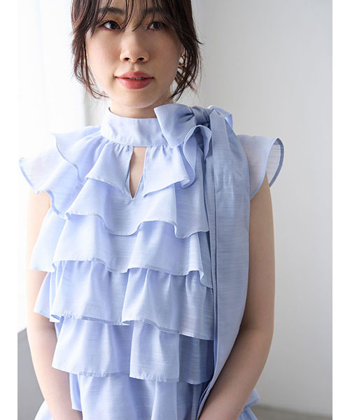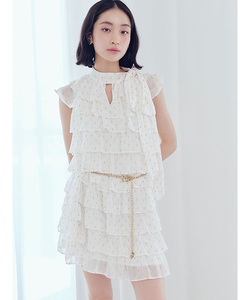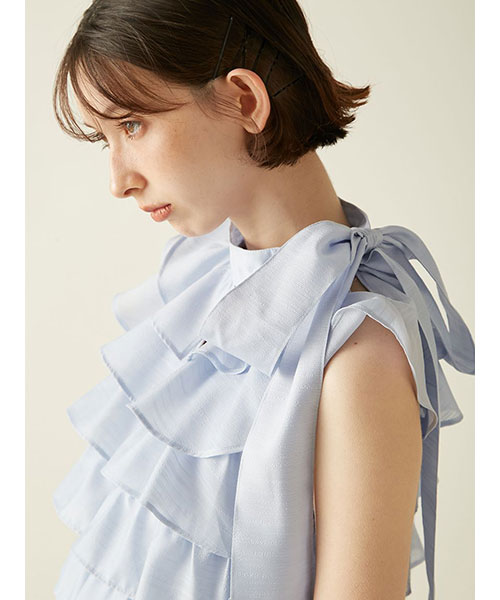ハリ感と軽やかさをあわせ持つ素材を使用し、フリルの立体感を美しく表現。動くたびに揺れる軽やかな素材感が、ドラマティックなシルエットを引き立てます。