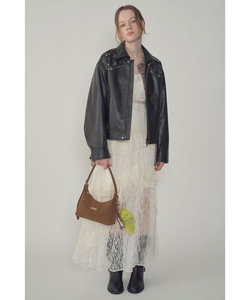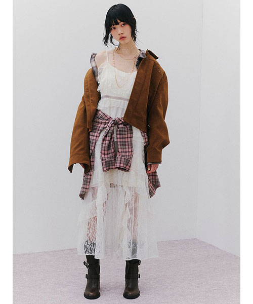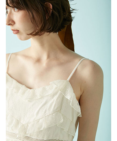ANNA SUIとのコラボレーション第2弾として登場した、繊細な2種類のレースを贅沢にあしらったスペシャルドレス。背面には蝶と2ブランドのロゴ刺繍を施し、バックスタイルにもこだわりを。肩とウエストにあしらったベルベットテープが、レースとの素材コントラストを際立たせ、上品なアクセントに。総裏地付きで透け感は抑えつつ、ウエストのレーステープ部分のみシアーな仕様に仕上げました。前後逆でロゴ刺繍を前面にして着用したり、キャミソールタイプなので、インナーとのレイヤードを楽しんだり季節を問わず着用いただけます。