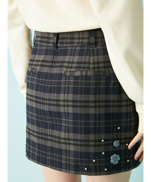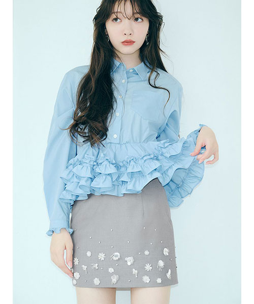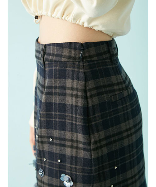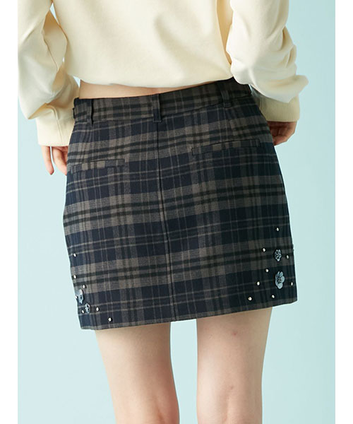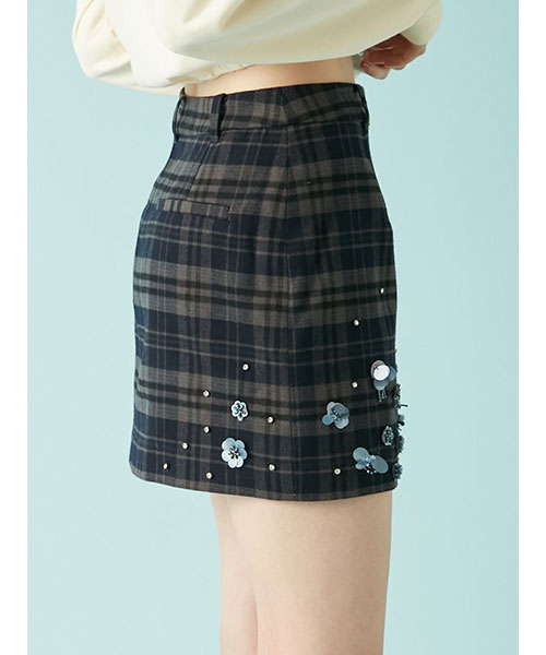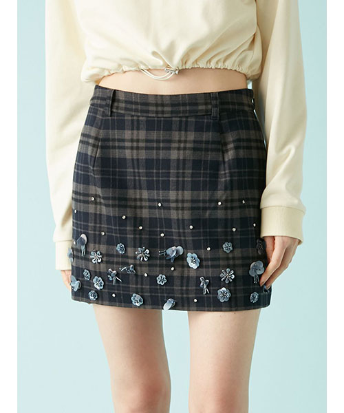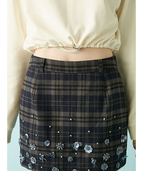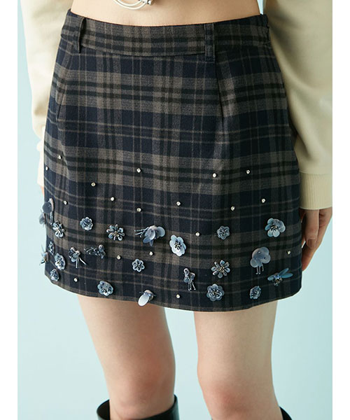ラグジュアリーなビジューパーツを贅沢に散りばめた、トレンド感満載のスカショーパン。インナーパンツ仕様で安心感がありつつ、短丈シルエットで今っぽいスタイリングが楽しめます。ベルトループやヒップポケットなど、スラックスを思わせるディテールを取り入れることで、リメイク風の遊び心とモードな表情を両立。各カラーごとに異なる立体的な装飾が映える、特別感あふれる一本です。