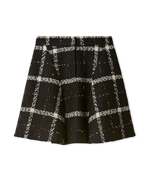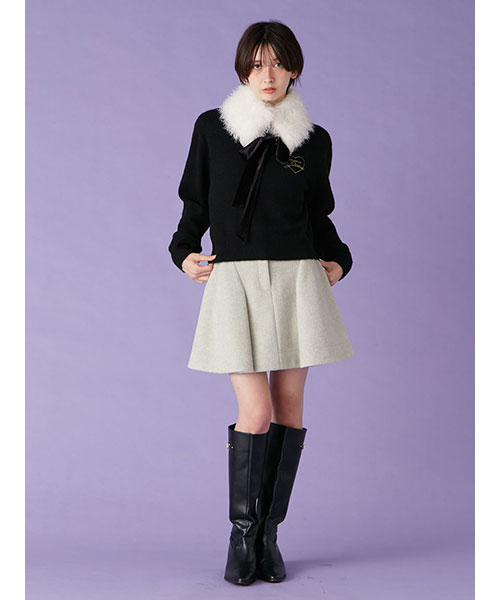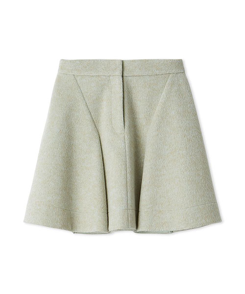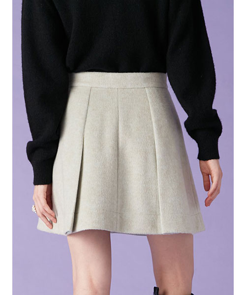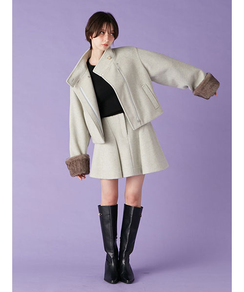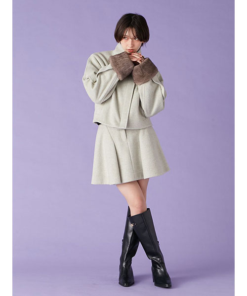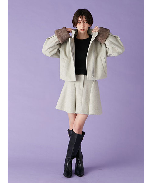 「LILY BROWN」定番のフィット&フレアシルエットミニスカートが今季も登場。フロントのタックは少し流れのある角度に設計し、甘くなりすぎない大人の印象に仕上げました。シャツブラウスをインしてきれいめに、スウェットやコンパクトなニットトップスを合わせてミニマルに、と幅広いスタイリングで活躍。同素材のコート(LWFC255125)とのセットアップコーデもおすすめです。