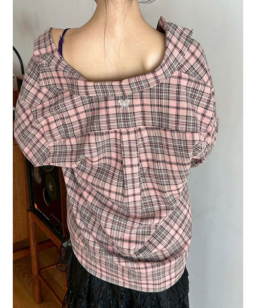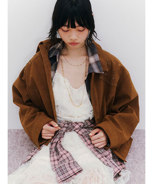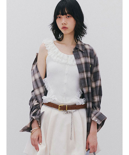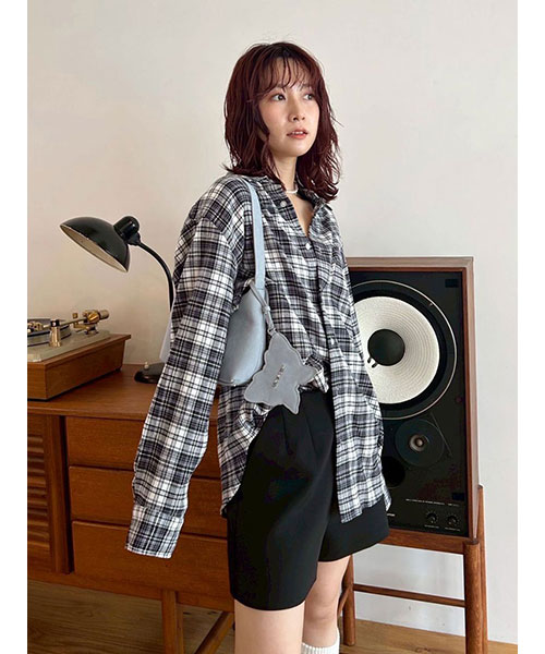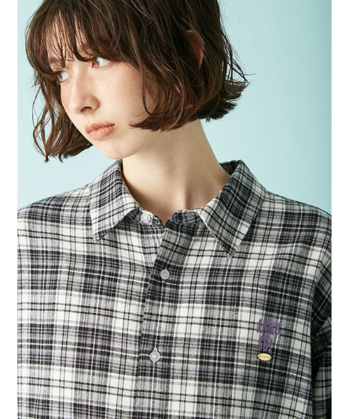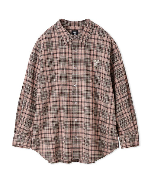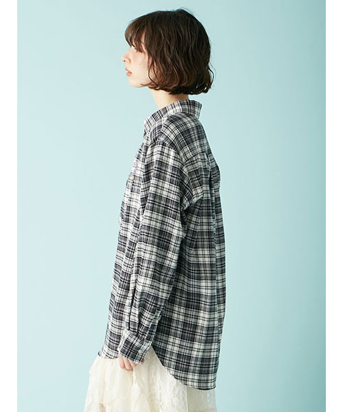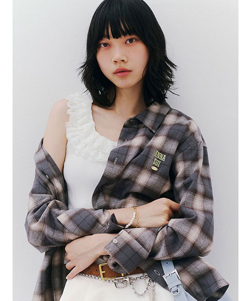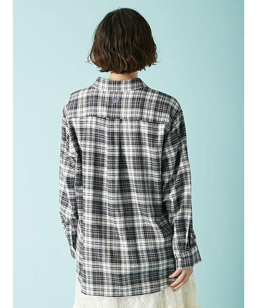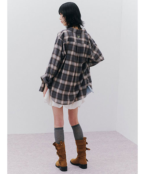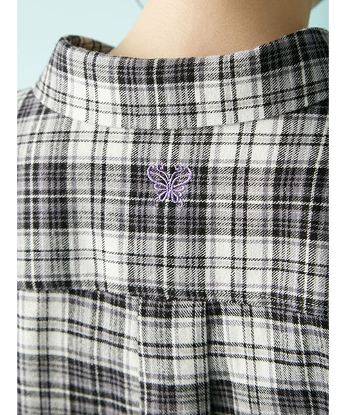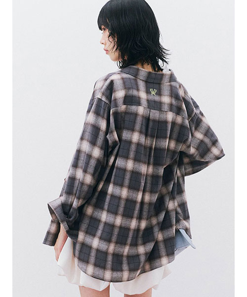 【Design/Styling】オリジナルで織り上げた先染めチェックを使用した、ANNA SUIコラボのネルシャツ。ほどよく落ち感のあるオーバーサイズシルエットで、1枚着はもちろん、羽織りとしても活躍します。今季は腰にラフに巻いて、コーディネートのアクセントとして取り入れるのもおすすめ。左胸には「ANNASUI」の刺繍、後ろ襟下にはバタフライ刺繍を施し、ディテールまでこだわった一枚です。