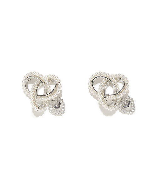 パールとメタルが結び目のようにデザインされたノットピアス。揺れるハートモチーフがフェミニンなアクセントを加え、ヴィンテージライクな風合いで耳元にこなれ感を演出します。カジュアルからきれいめスタイルまで幅広く合わせやすいアイテムです。