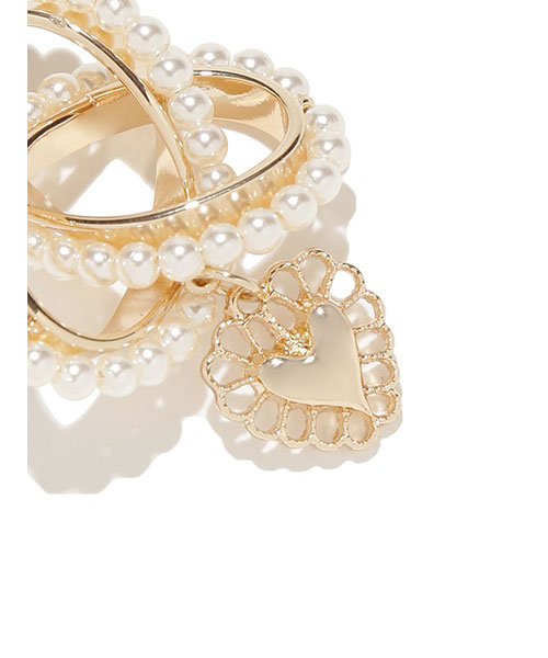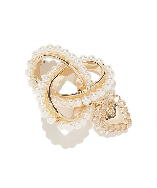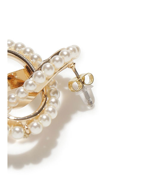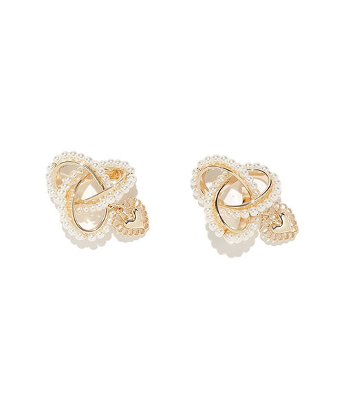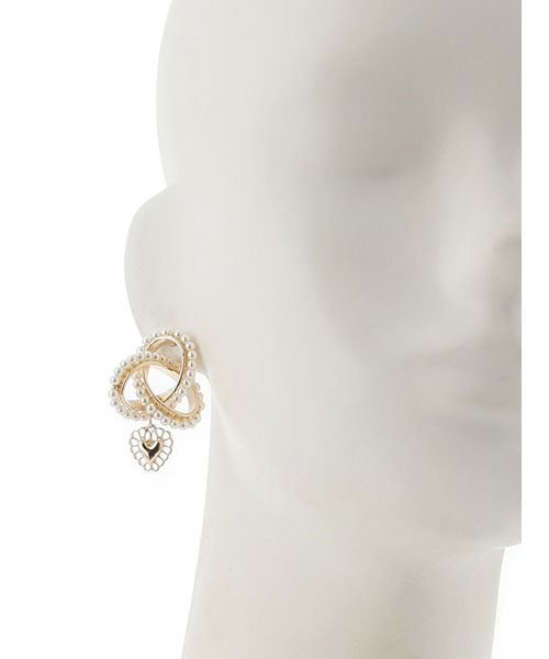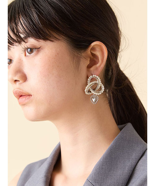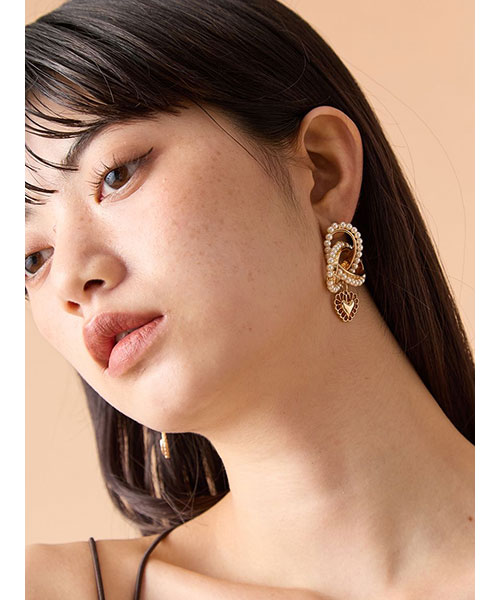 パールとメタルが結び目のようにデザインされたノットピアス。揺れるハートモチーフがフェミニンなアクセントを加え、ヴィンテージライクな風合いで耳元にこなれ感を演出します。カジュアルからきれいめスタイルまで幅広く合わせやすいアイテムです。