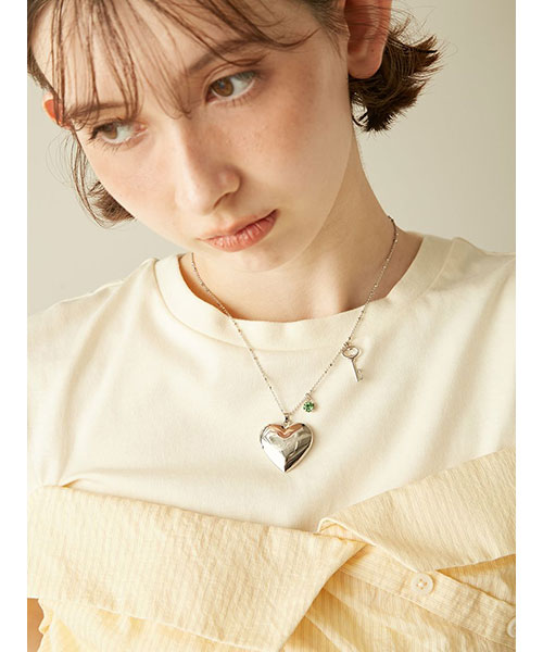 ぷっくりとしたハート型のロケットに写真を入れられる特別感たっぷりのデザイン。イニシャルを刻んだオープンハートに、鍵モチーフとガラスストーンが華やかさを添えます。カラーごとに異なるイニシャルが込められており、大切な人へのギフトにもおすすめです。