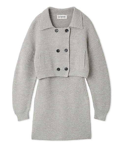 ニットジャケットとミニワンピースがセットになった着映え力抜群のアイテム。ジャケットは大きめの襟が顔まわりに抜け感を添え、前を閉じればトップス風に着られる2WAY仕様。ワンピースは程よくタイトなシルエットながら、ジャケットと同じ片畦編みの厚みでボディラインを拾いすぎず安心して着用いただけます。セットアップではもちろん、それぞれ単品使いでもスタイリングの幅が広がる万能セットです。