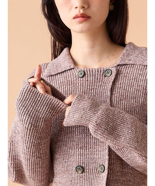 ネップヤーンなどの3種類の糸をミックスし、表情豊かなメランジ調に仕上げたこだわりのニット。立体感がありながらも柔らかな肌触りで、秋冬らしい温かみも演出します。