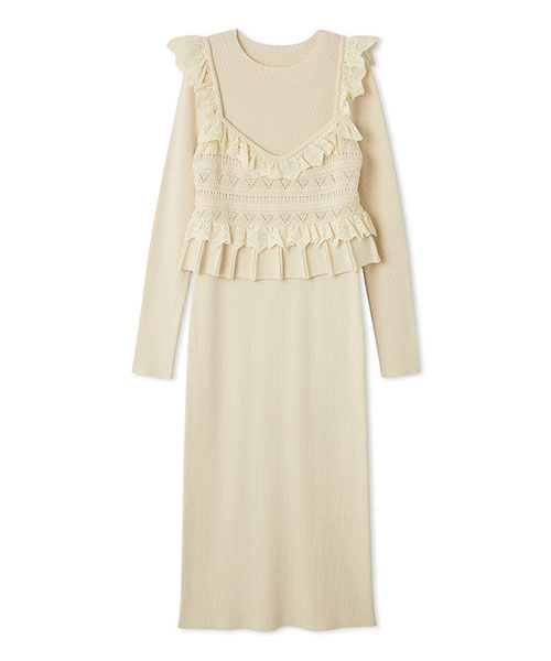 毎シーズン人気のビスチェセットニットワンピースが、今季はレース素材と融合しヴィンテージフェミニンなムードにアップデート。ワンピースは2×2リブ編みで仕立て、身体のラインを拾いすぎない美しいシルエットに。ビスチェにはレース柄風の編み地を取り入れ、立体的な表情をプラス。背面にはベロアリボンをあしらい、バックスタイルにも抜かりない華やかさを演出しました。