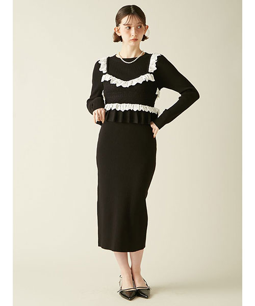 ワンピース本体は伸縮性のあるリブニットで快適な着心地に。ビスチェ部分にはレース風の編み柄とベロアリボンを組み合わせ、異素材の質感が際立つ一枚です。